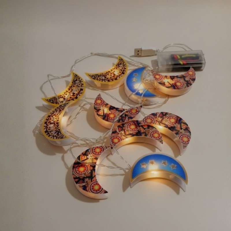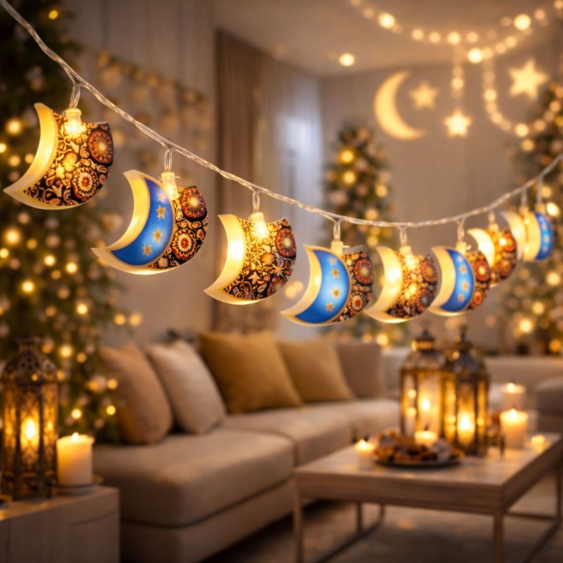 سلسلة أضواء رمضانية مميزة على شكل أهلة مزخرفة، تجمع بين الطابع التراثي والتقنية الحديثة. مصممة خصيصاً لإضفاء أجواء رمضانية ساحرة في منزلك.