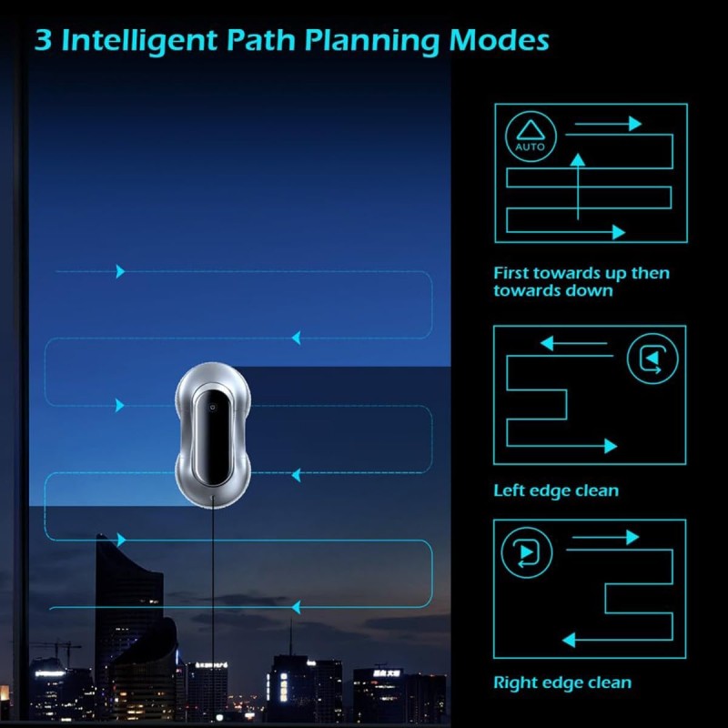 • ذكاء اصطناعي (AI): يخطط مسار التنظيف بذكاء مع 3 أوضاع (أفقي، رأسي، وزي المتعرج) لتغطية كاملة بدون تكرار.