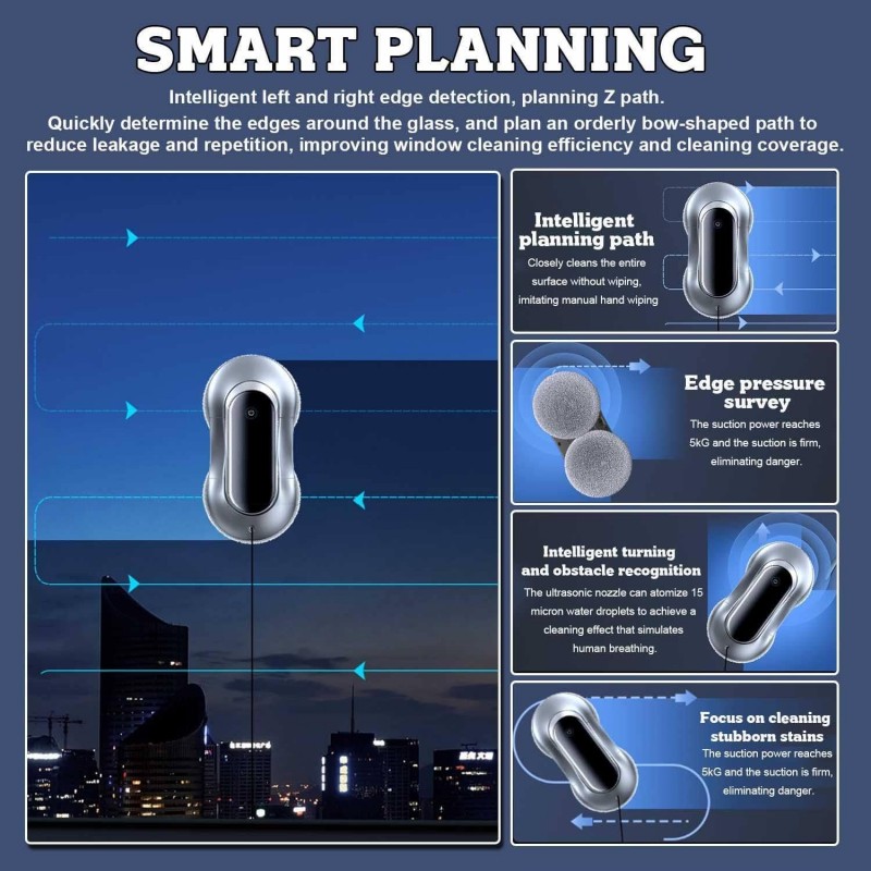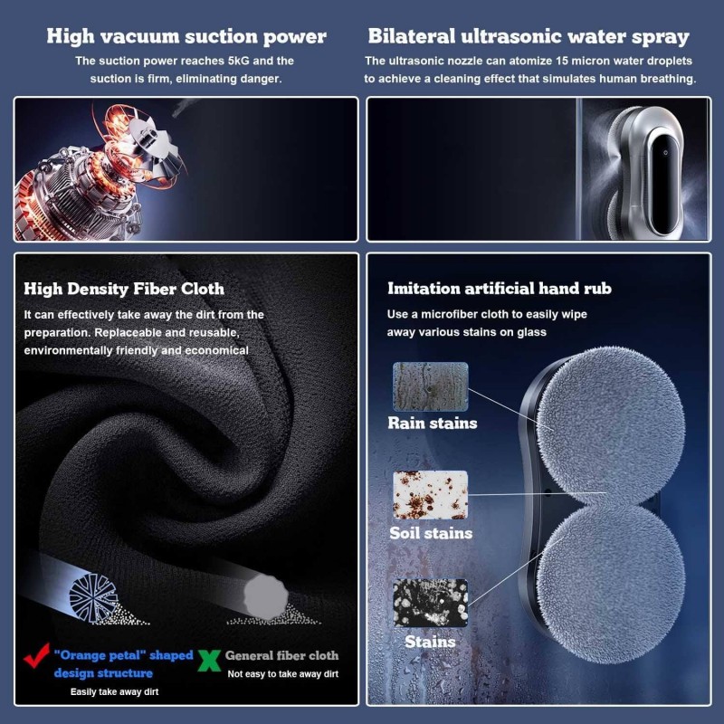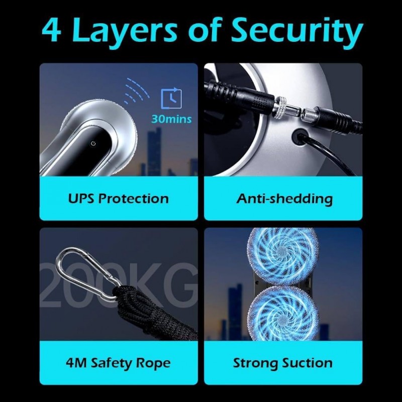 • قوة شفط قوية: تصل حتى 5600PA (حسب الموديل)، مع خاصية التعديل التلقائي لقوة الشفط لضمان ثبات الجهاز على الزجاج.