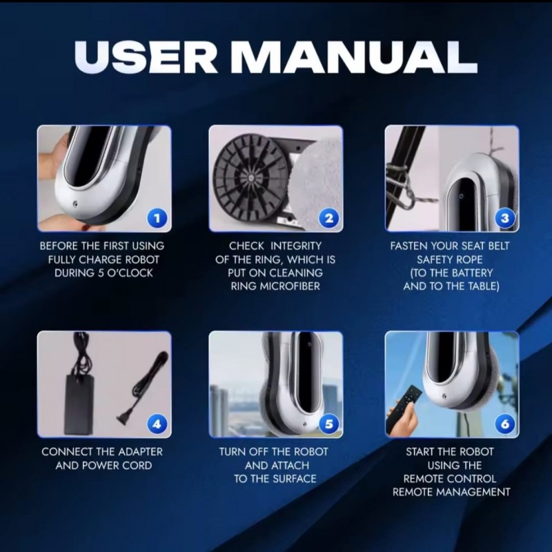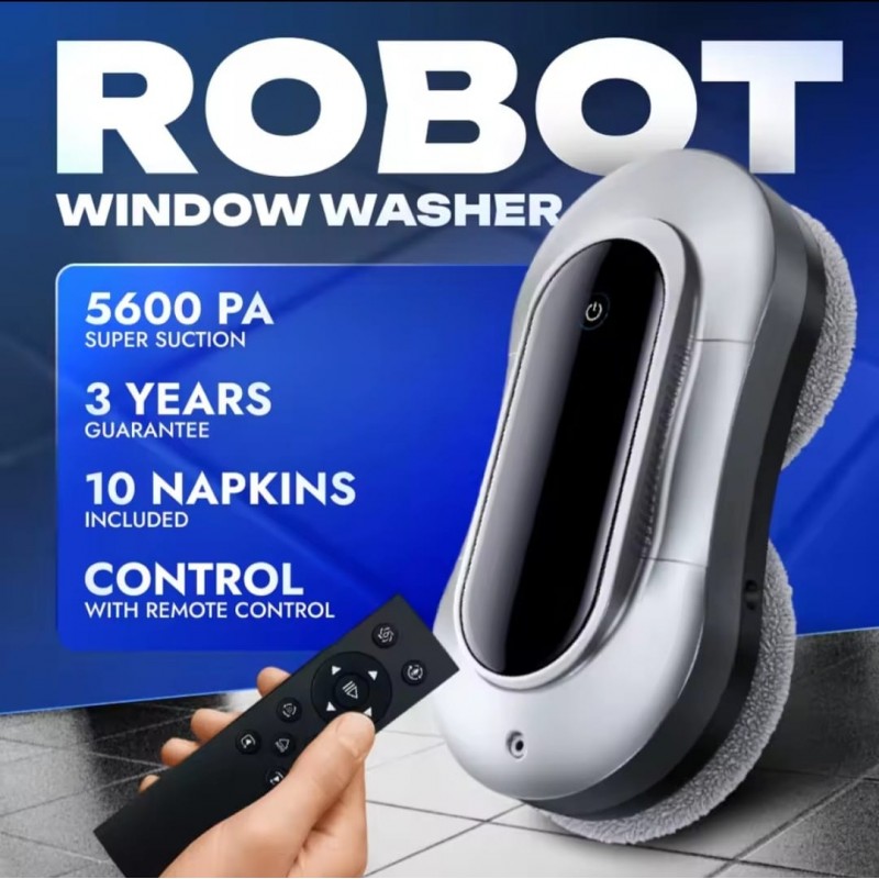 المنتج هو روبوت ذكي لتنظيف النوافذ (Window Cleaning Robot)، مصمم لتسهيل عملية تنظيف الزجاج بشكل آلي وفعّال مع ميزات أمان عالية.