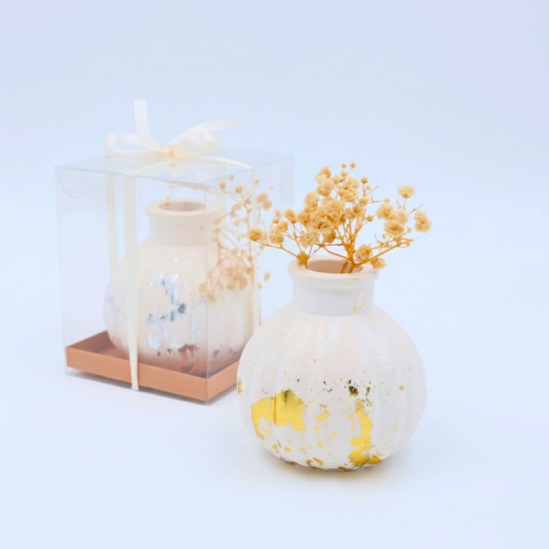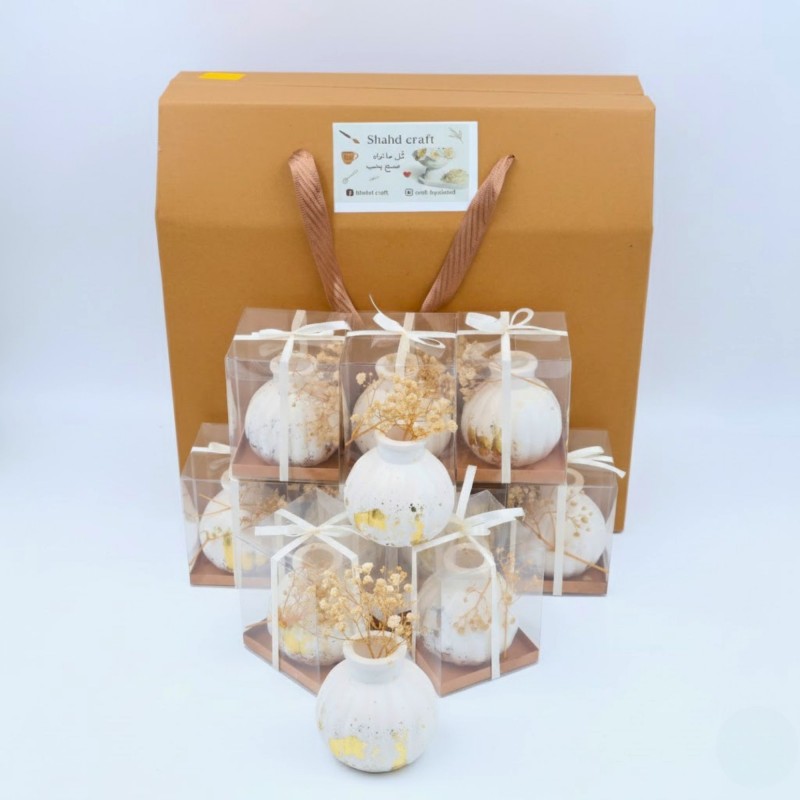 بكج توزيعات أنيق وفخم بتصميم أبيض ناعم مع لمسات ذهبية راقية، مزين بورود مجففة تضيف لمسة طبيعية ودافئة. كل قطعة تأتي داخل علبة شفافة أنيقة، جاهزة للتقديم وتناسب مختلف المناسبات.