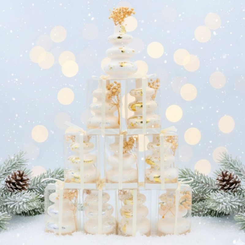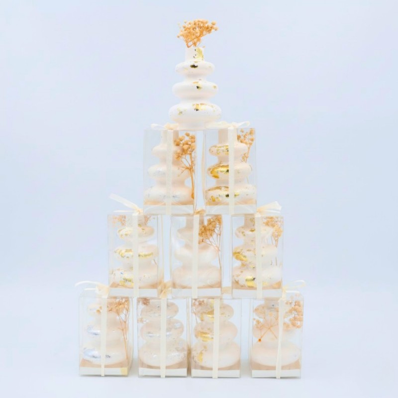 بكج توزيعات أنيق بتصميم راقٍ ولون أبيض هادئ مع لمسات ذهبية فاخرة، مرفق بورد مجفف طبيعي يضفي إحساسًا ناعمًا ودافئًا. يأتي كل قطعة بتغليف شفاف مرتب، مما يجعله خيارًا مثاليًا للتوزيعات في المناسبات الخاصة.