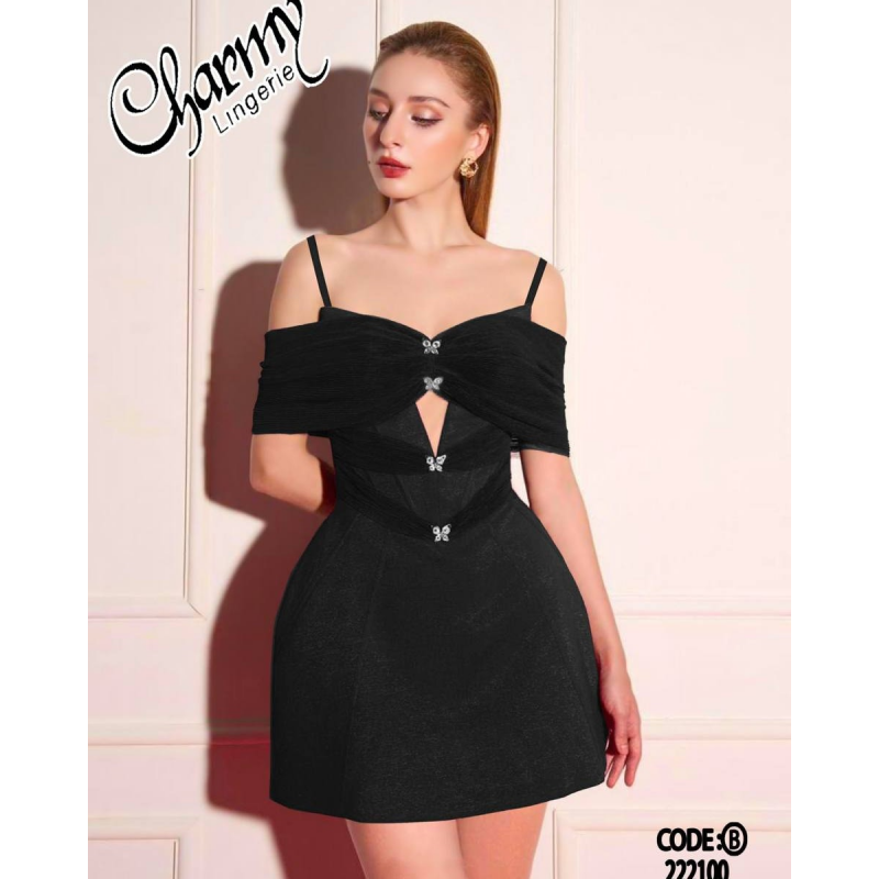 الصدر والأكتاف: تصميم مكشوف الأكتاف (Off-shoulder) مع حمالات رفيعة أنيقة، يتوسطه فتحة أمامية جذابة.