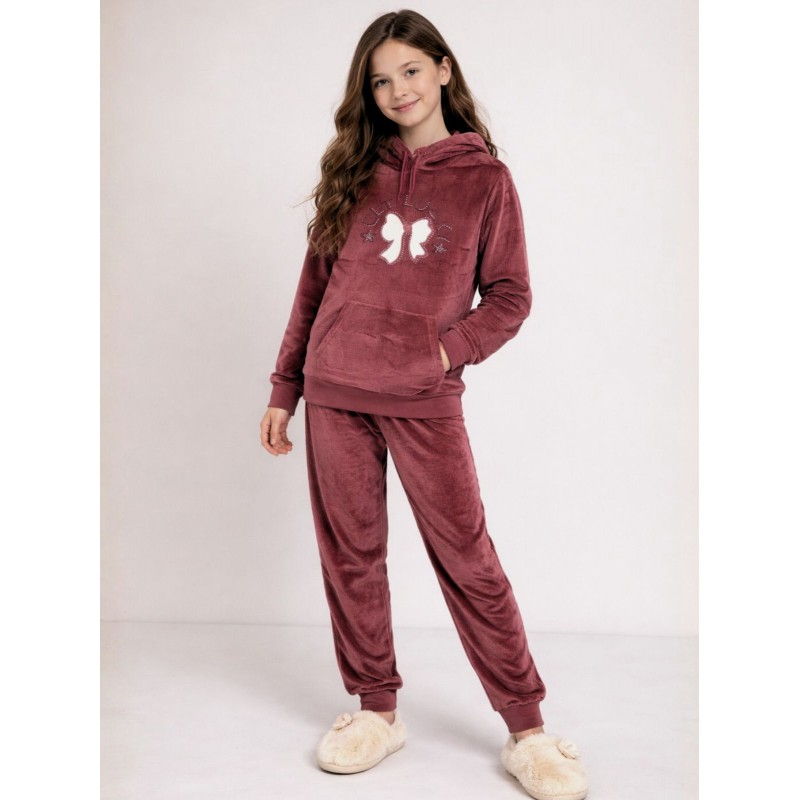 بجامة مخمل قطعتين بطاقية بناتي لون خمري