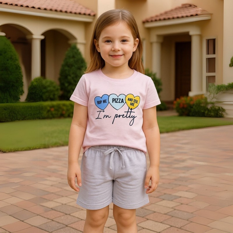 ✅ اللون: تيشيرت بطيخي وشورت أبيض.