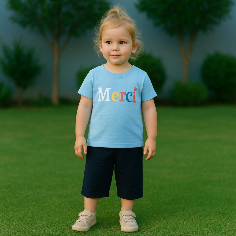 ✅ اللون: تيشيرت أزرق فاتح وشورت كحلي.