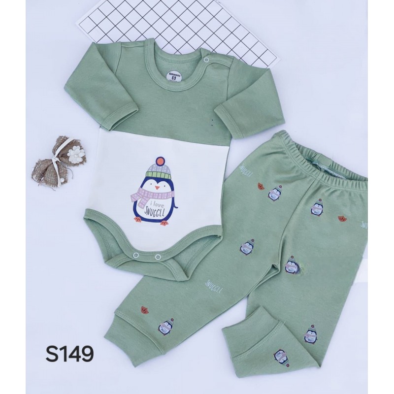 طقم بيبي مكون من قطعتين، قميص مزين برسمة بطريق لطيفة باللون الأخضر، مما يضفي لمسة من المرح والجاذبية. البنطال المريح يوفر راحة مثالية للطفل في جميع الأوقات.