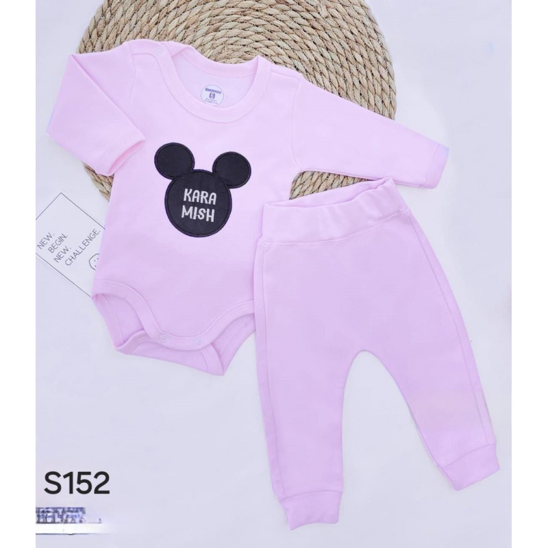 طقم بيبي مكون من قطعتين، مع رسمة ميكي الشهيرة التي تضيف لمسة من المرح والبراءة للطفل. يتضمن القميص ذو الأكمام القصيرة بنمط مريح وحيوي، مع بنطال مريح يسهل حركة الطفل ويضمن راحته طوال اليوم.