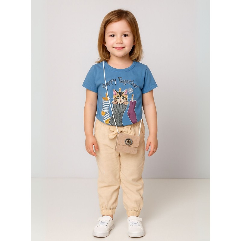 طقم بنطلون وتيشيرت للأطفال لون أزرق وبيج
