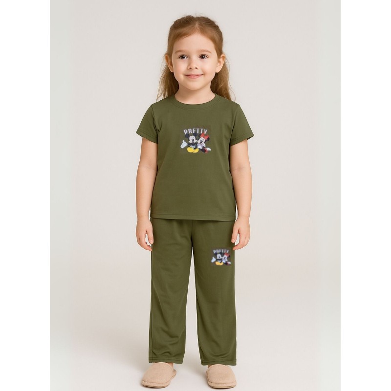 طقم بناتي قطعتين لون زيتي بنطلون + تيشيرت
