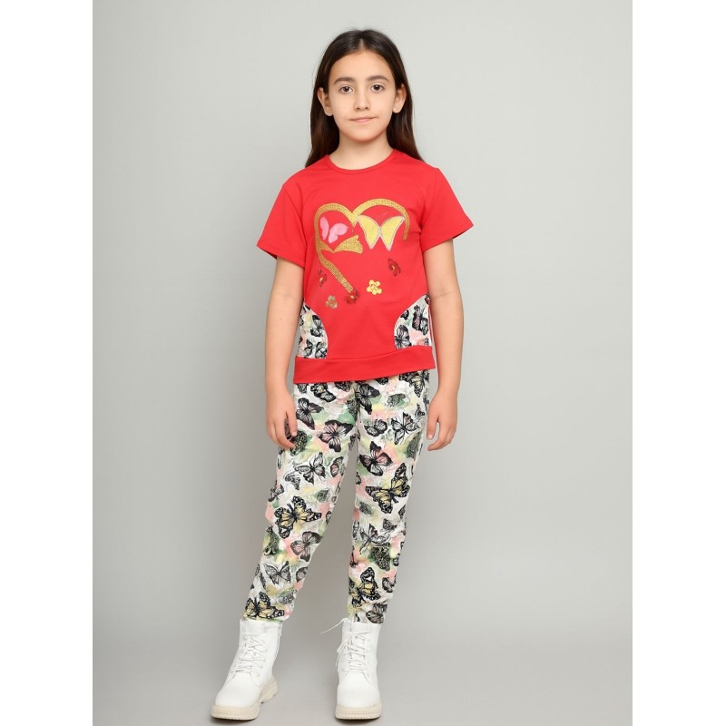 ✅ بلوزة قطنية باللون الأحمر بتصميم قلوب وفراشات لامعة