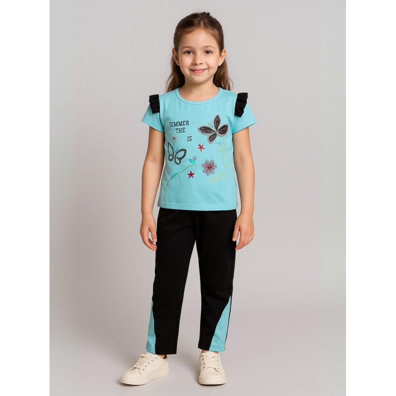 بجامة بناتي بأكمام قصيرة (قطعتين) لون أزرق وأسود