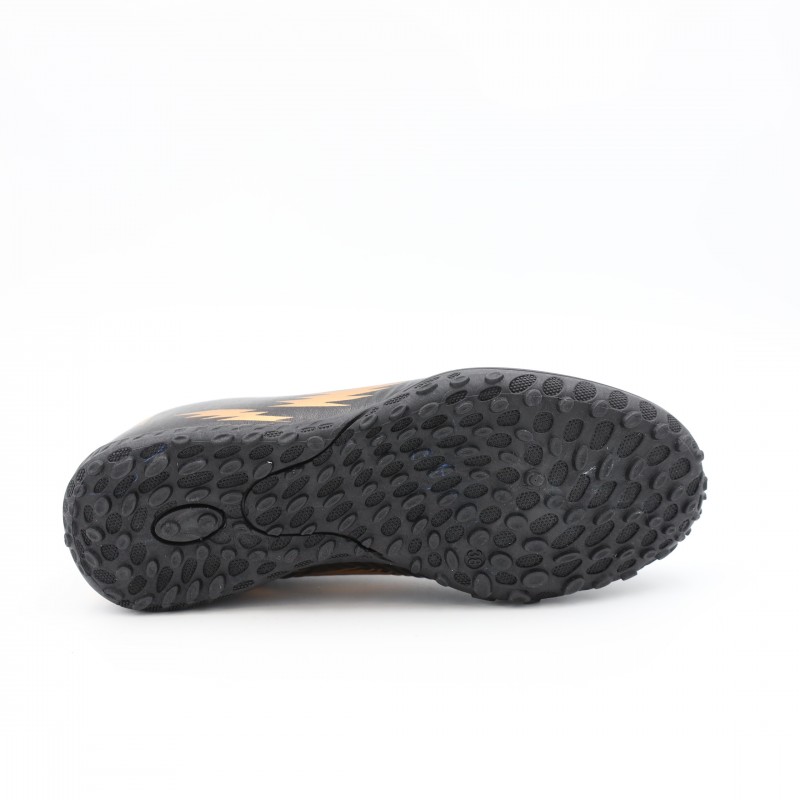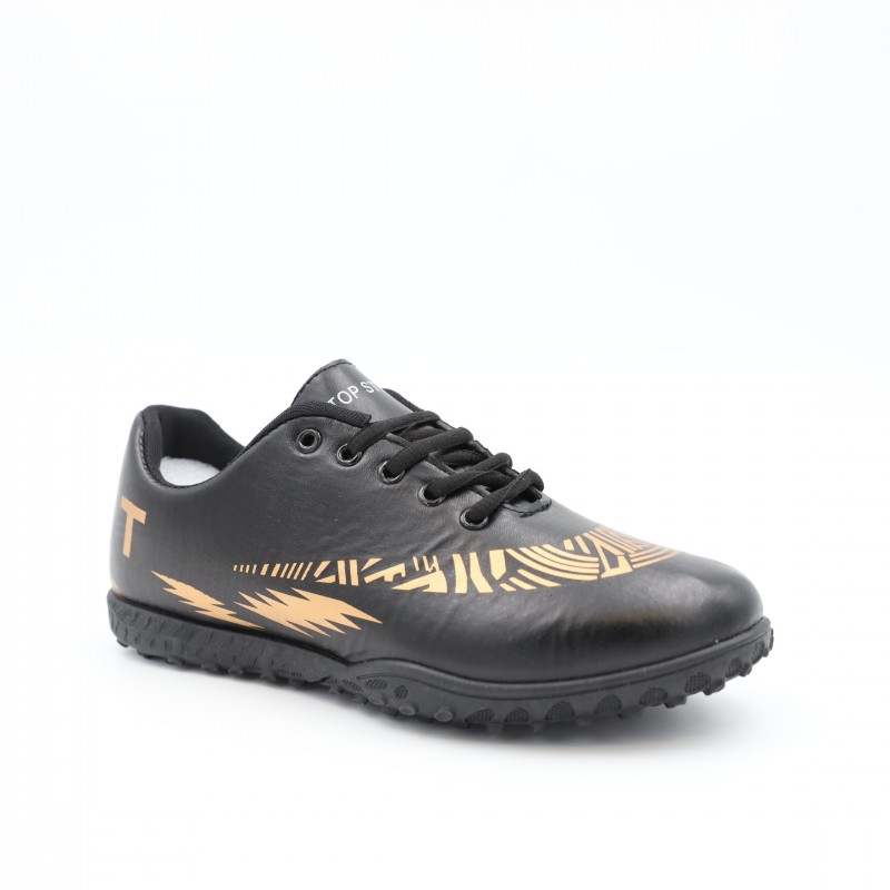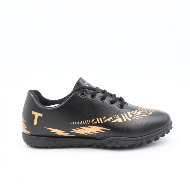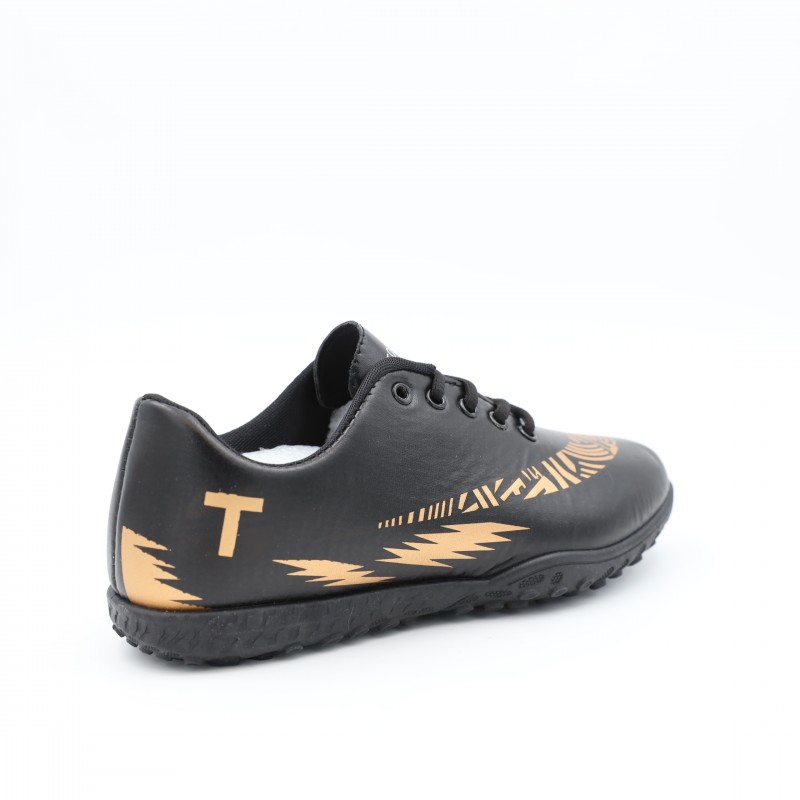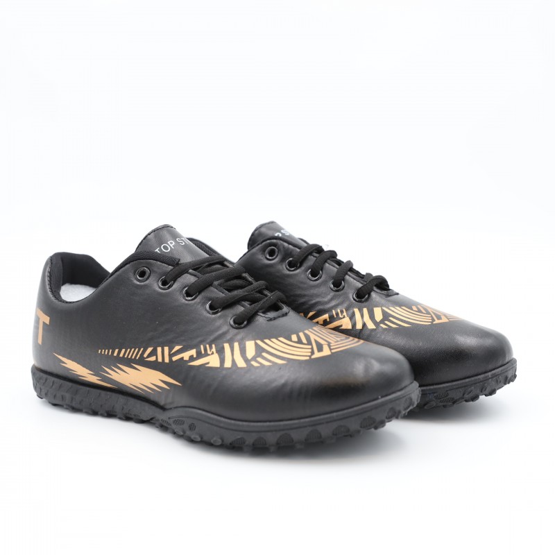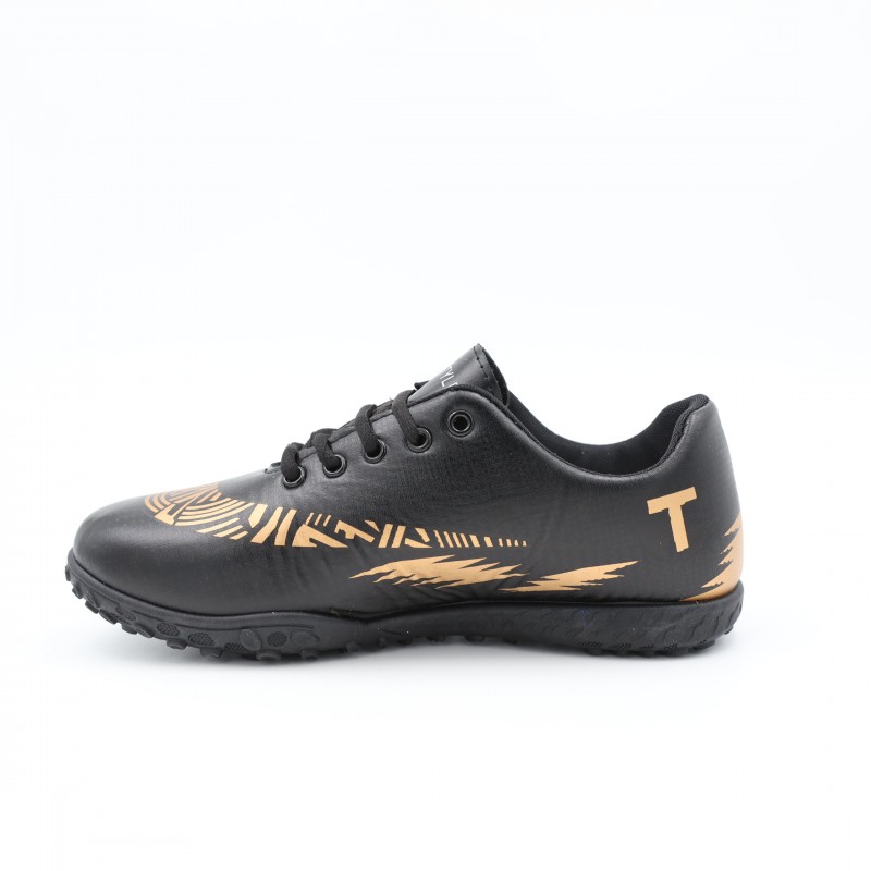 حذاء رياضي مخصص لكرة القدم يتميز بتصميم عصري وأنيق باللون الأسود مع زخارف ذهبية لافتة، يوفر الأداء العالي والراحة في نفس الوقت.