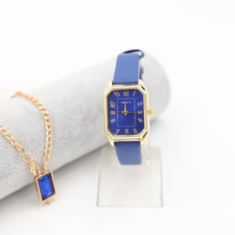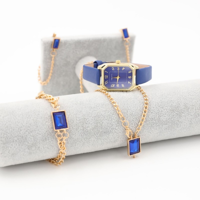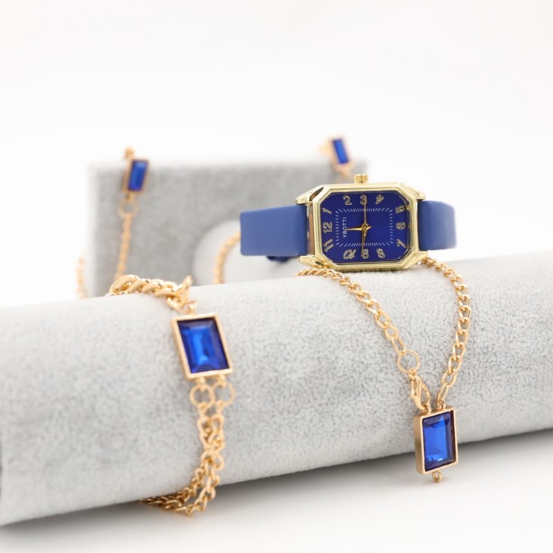 بكج ساعة جلد لون أزرق للنساء مع 3 قطع إكسسوارات