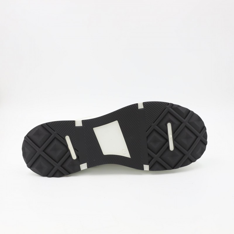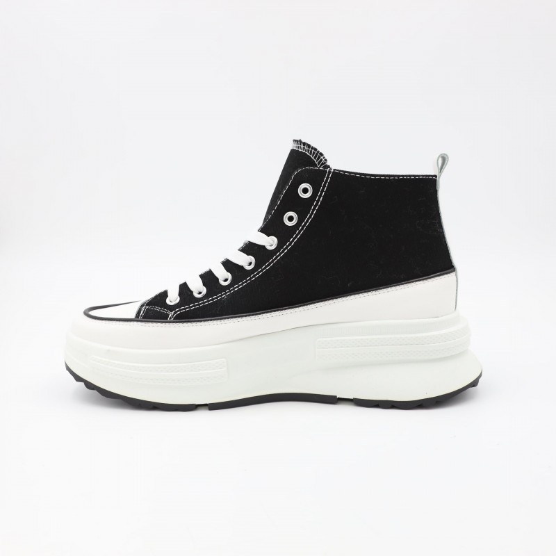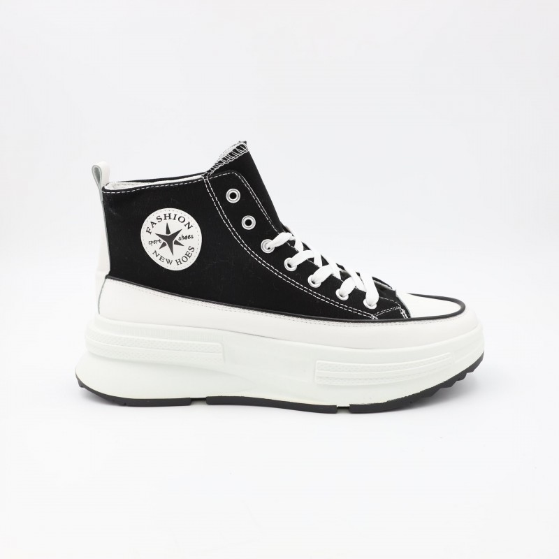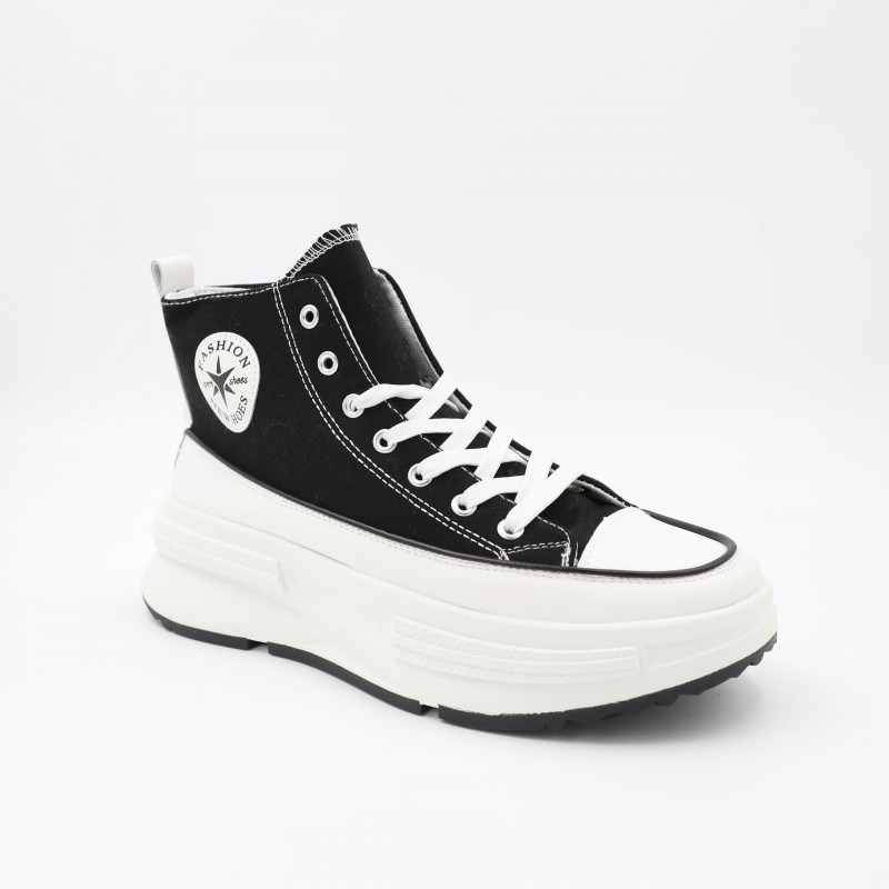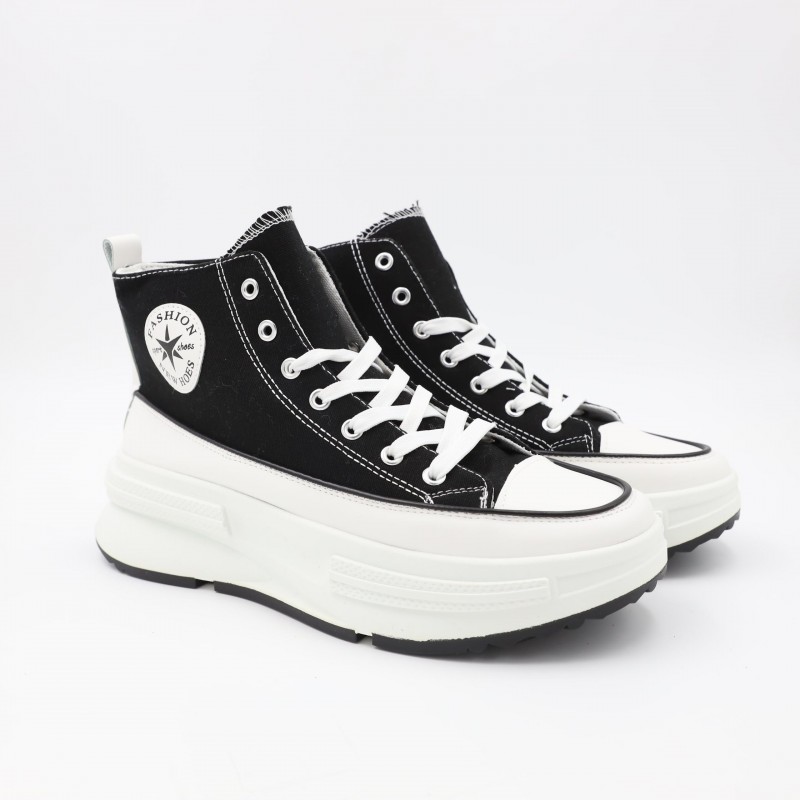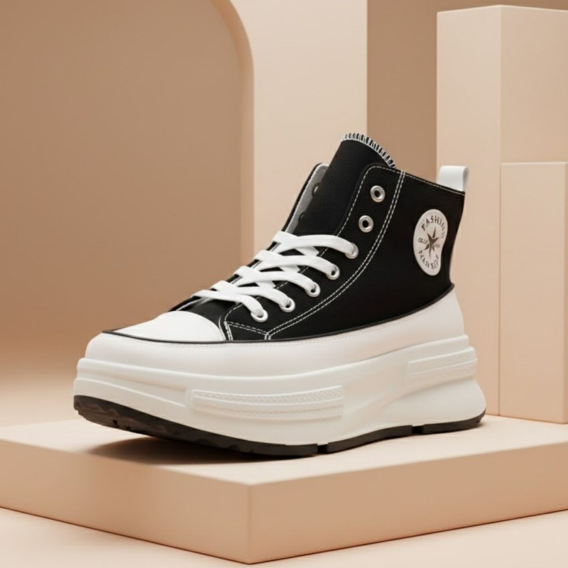 حذاء كاجوال شبابي بتصميم عصري وجذاب، مصنوع من قماش متين باللون الأسود مع تفاصيل خياطة واضحة تضيف لمسة أنيقة. يتميز بنعل أبيض عريض وعالي يوفر راحة إضافية وامتصاصاً جيداً للصدمات، مع قاعدة سفلية مانعة للانزلاق لثبات أفضل أثناء المشي. تصميم عملي يناسب الإطلالات اليومية والكاجوال، مثالي للارتداء الطويل والتنقل اليومي.