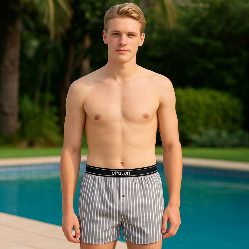 بوكسر رجالي بلون أبيض أنيق مع خطوط طولية ناعمة وتصميم بأزرار أمامية لسهولة اللبس، يجمع بين الراحة اليومية والستايل الكلاسيكي.