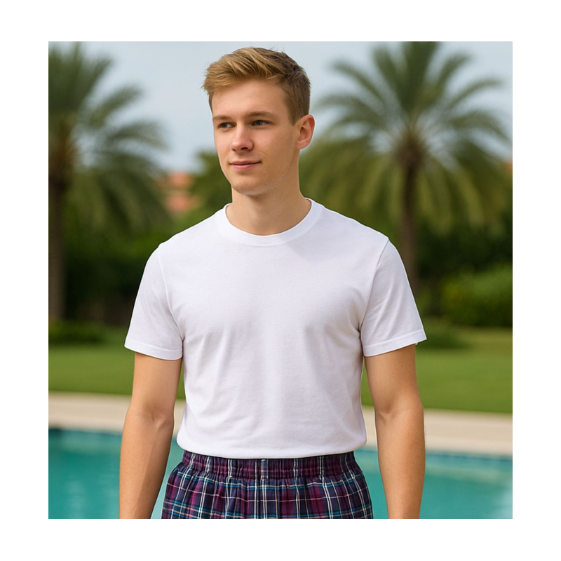 تيشيرت داخلي رجالي بأكمام قصيرة، بلون أبيض نقي وقماش قطن ناعم بيوفّر لك تهوية وانتعاش حتى بأيام الصيف. تصميم مريح يثبت على الجسم بدون شد أو علامات، وبيليق تلبسه لوحده أو تحت القمصان.