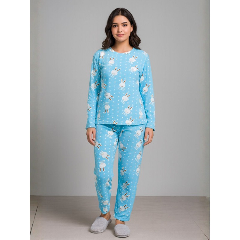 بيجامة فرو للصبايا برسوم رأس أرنب لون أزرق سماوي