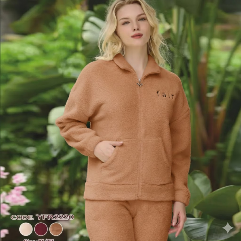 بجامة فرو نسائية قطعتين بسحاب لون كرميدي فاتح