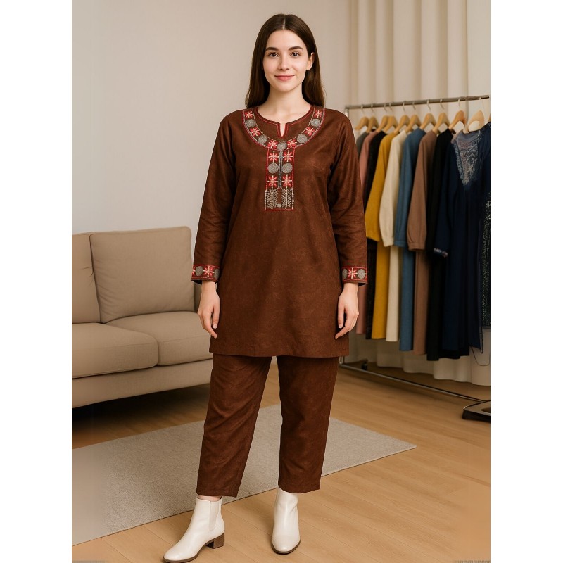 بجامة نسائية حجم وافي مُكونة من قطعتين لون بني