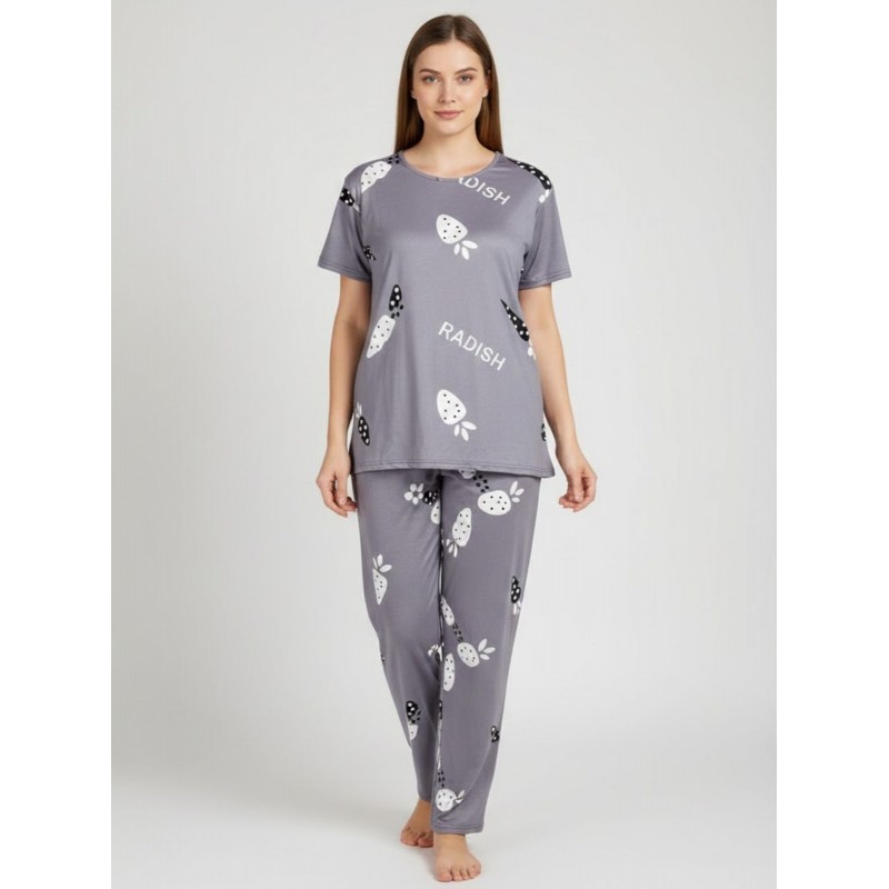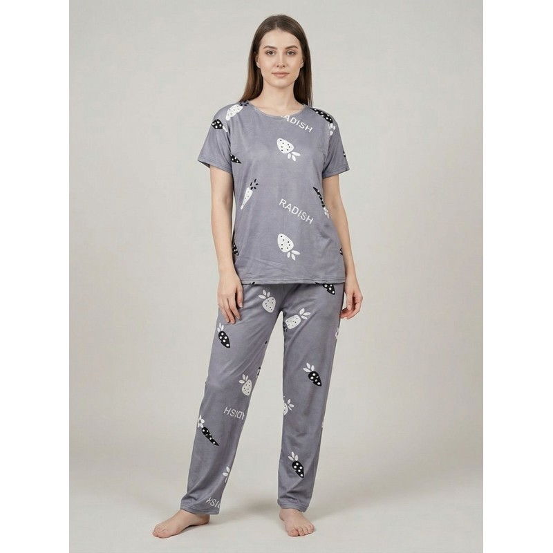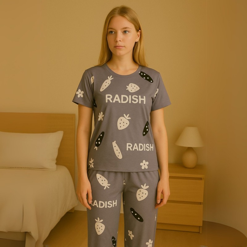 تتكون البجامة من قطعتين؛ بنطلون قطني مريح مع تيشيرت بأكمام قصيرة. التصميم بسيط وأنيق، مع تفاصيل دقيقة تعكس الطابع العصري والمريح.
