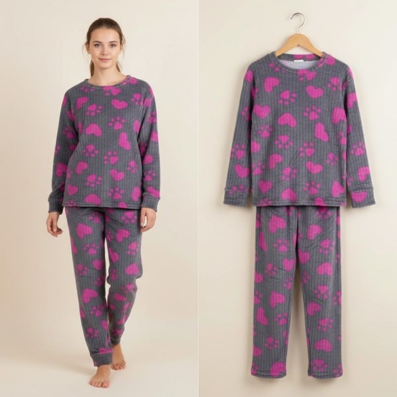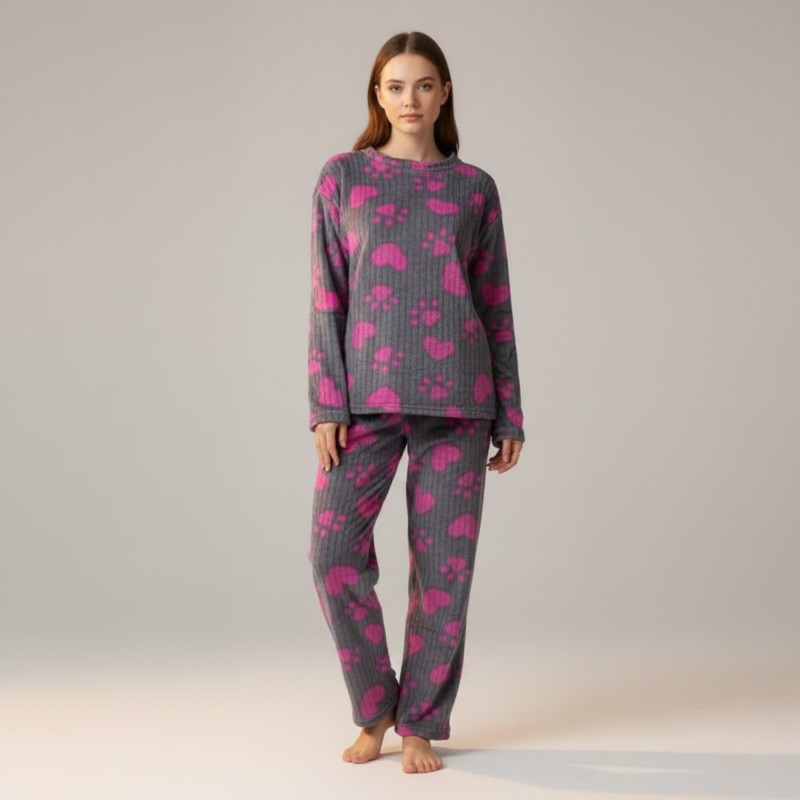 بيجامة صوف للنساء لون سكني بتصميم آثار أقدام