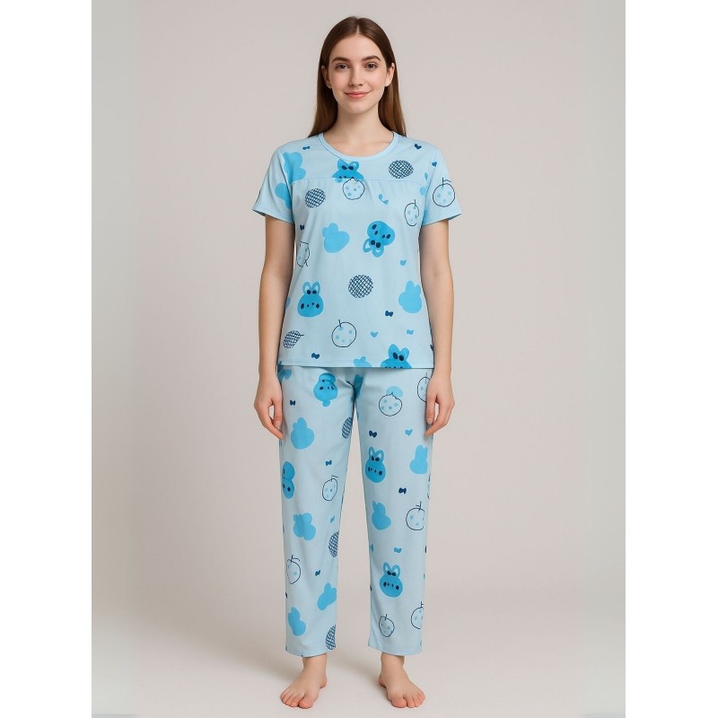 بيجامة ستاتية لون أزرق اشكال ملون بنطلون وبلوزة نص كم One Size