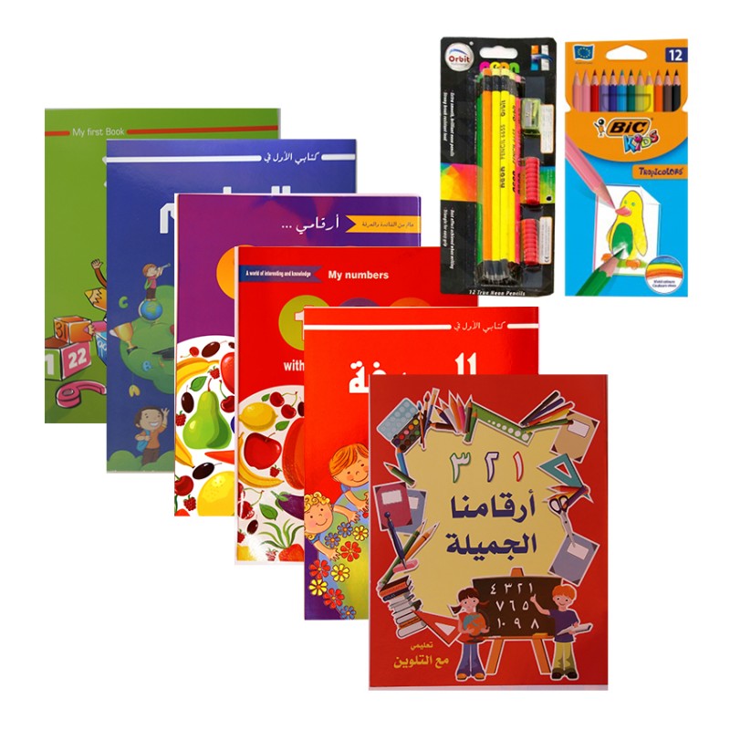 رزمة تحتوي على 6 دفاتر تعليمية حروف وارقام انجليزية وعربية والعلوم والمعرفة بالاضافة الى علبة الوان خشبية 12 لون نوع بيك الاصلي بالاضافة الى دزينة اقلام رصاص نوعية اوربت الاصلية