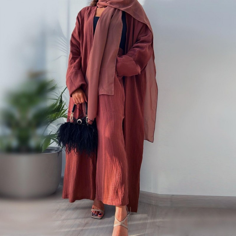 عباية لف أنيقة بتصميم عصري مكوّنة من قطعتين مع بنطلون متناسق، باللون الخمري الدافئ الذي يمنح إطلالة فخمة وراقية. تتميز بقصة لف مفتوحة من الأمام مع تصميم واسع ومريح يناسب مختلف الأجسام، وأكمام واسعة تضيف لمسة أنثوية ناعمة.