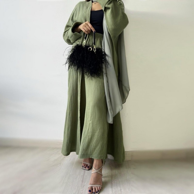عباية لف أنيقة بتصميم عصري مكوّنة من قطعتين مع بنطلون متناسق، باللون الزيتي الهادئ الذي يعكس الذوق الراقي والبساطة العصرية. تأتي العباية بقصة مفتوحة من الأمام تمنحك حرية الحركة ولمسة أنثوية ناعمة، مع أكمام واسعة تضيف راحة وأناقة في آن واحد.
