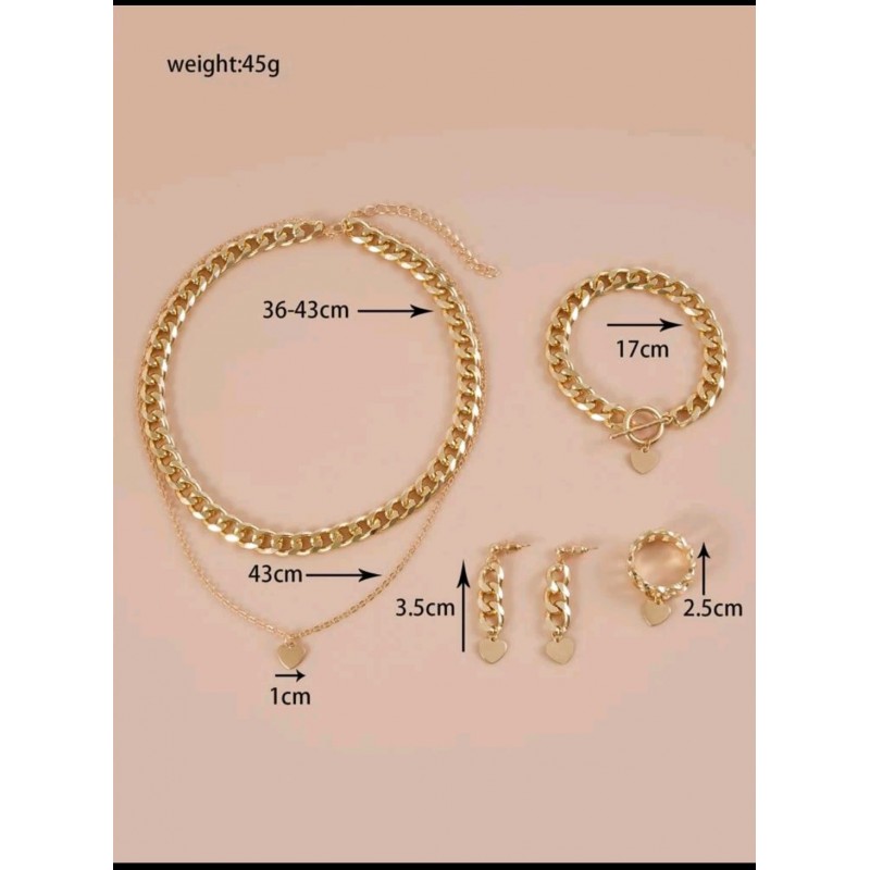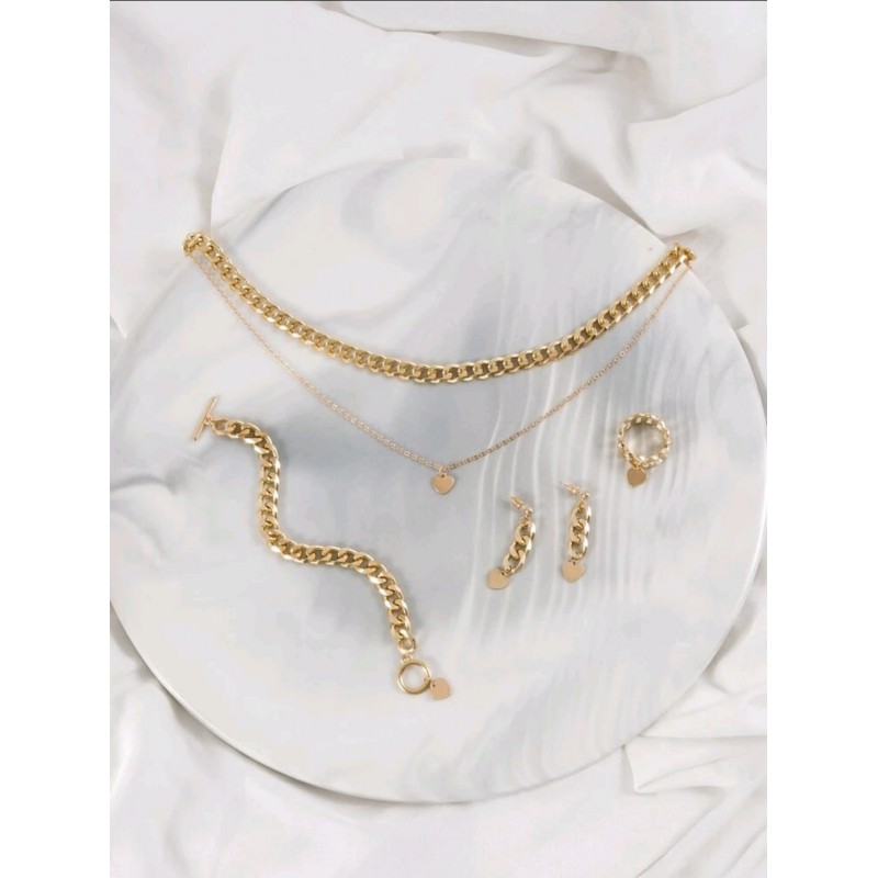 طقم اكسسوار ذهبي شكل جنزير بقلادة شكل قلب مكون من سنسال واسوارة وخاتم وحلق
