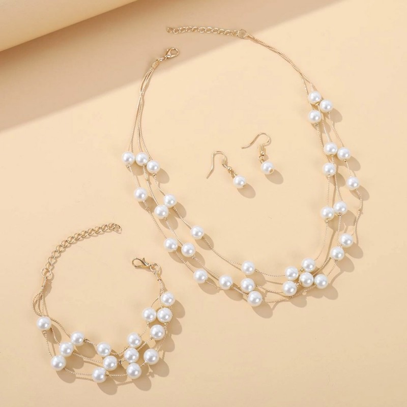 طقم اكسسوار لون ذهبي مرصع باللولو الابيض بحجم متوسط مكون من سنسال وحلق واسوارة