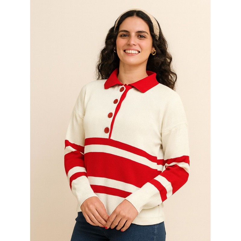 بلوزة ستاتي لون بيج مخطط أحمر