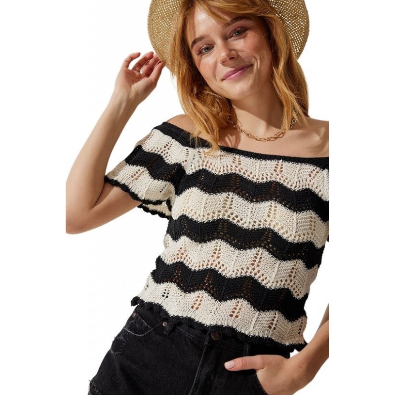 بلوزة مخرمة صوف باللون الاسود والبيج