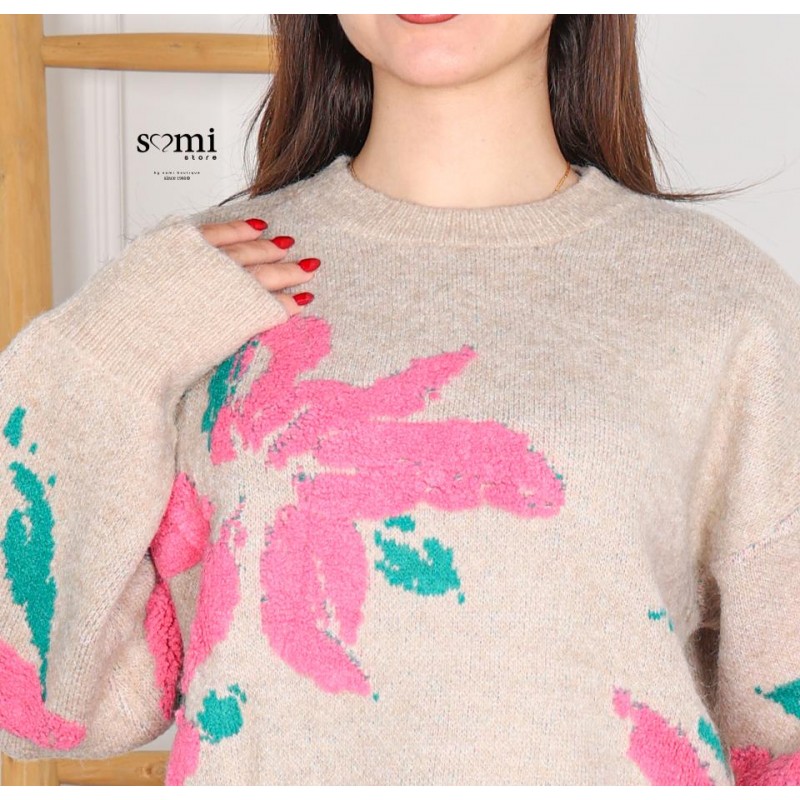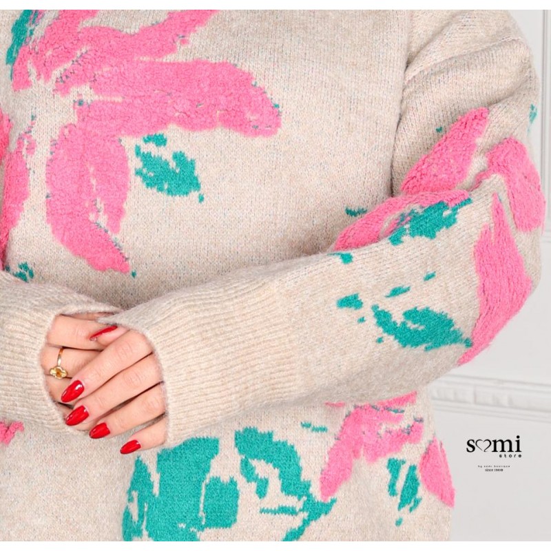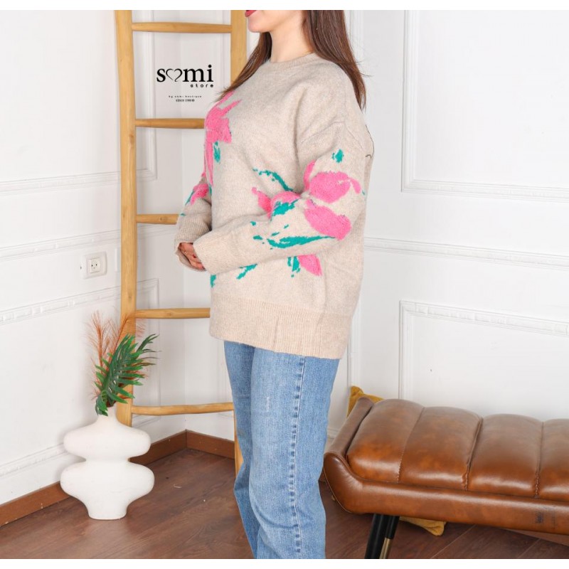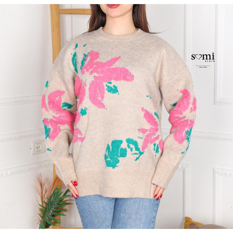 بلوزة شتوية ناعمة بلون بيج أنيق، مزينة برسومات زهرية باللونين الزهري والأخضر تضيف لمسة حيوية وجذابة. تتميز بخامة صوف دافئة وقصة مريحة تناسب الإطلالات اليومية، وتمنحك إحساسًا بالدفء والأناقة في آن واحد.