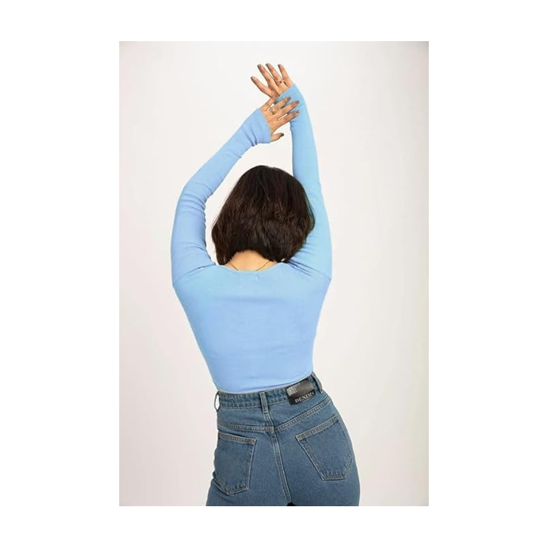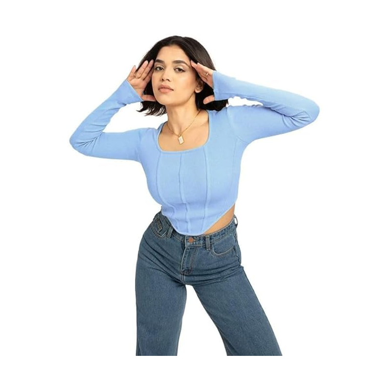 بلوزن قطنية بباقة رقبة مربعة للنساء لون ازرق فاتح