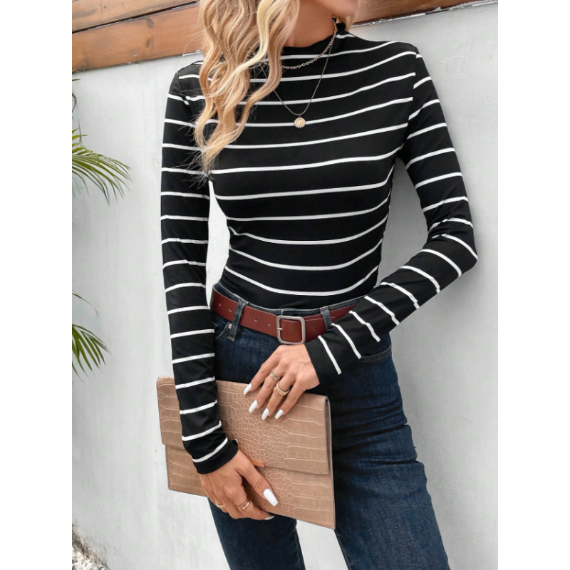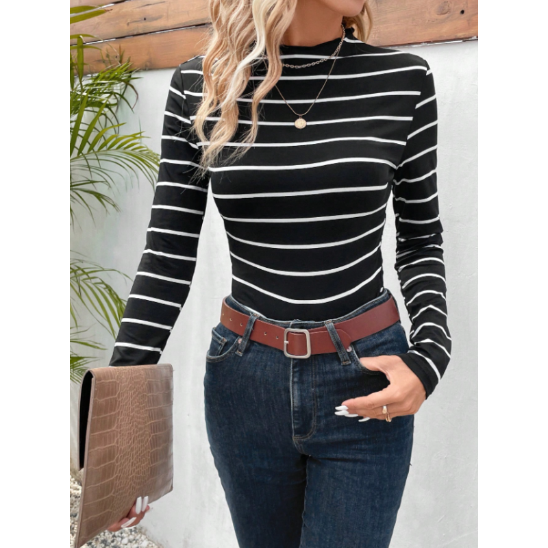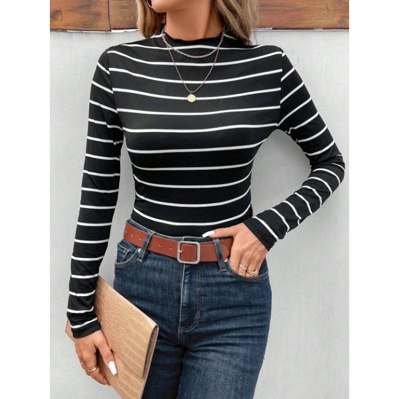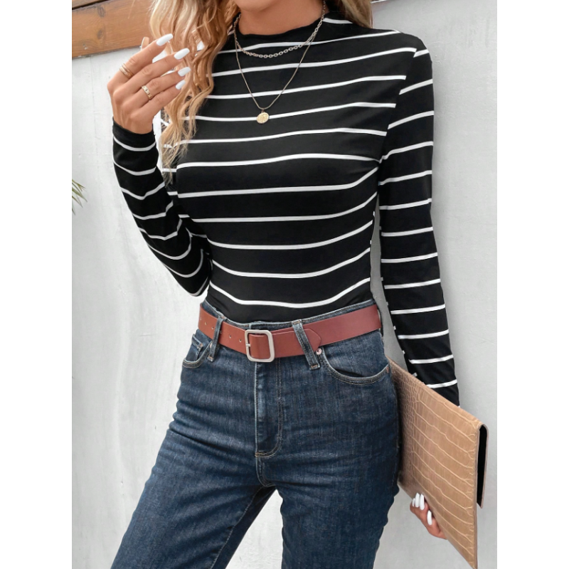 تيشيرت نسائي أنيق بنقشة مخططة وياقة عالية – ستايل عصري يومي