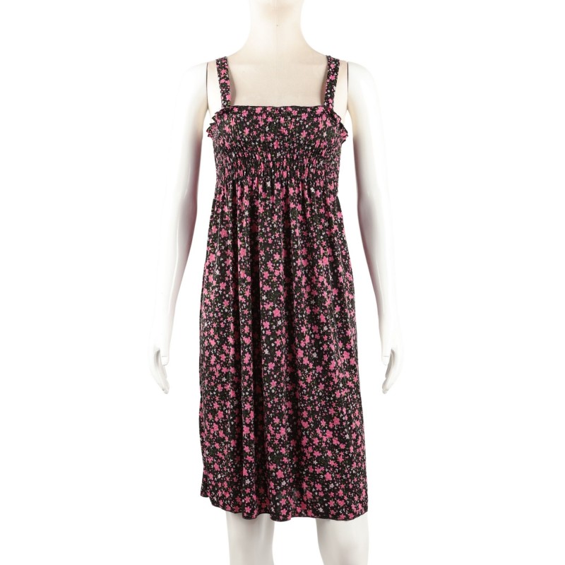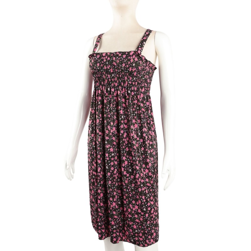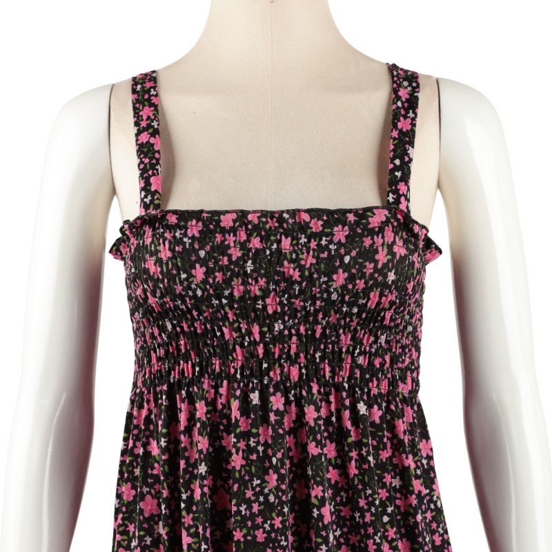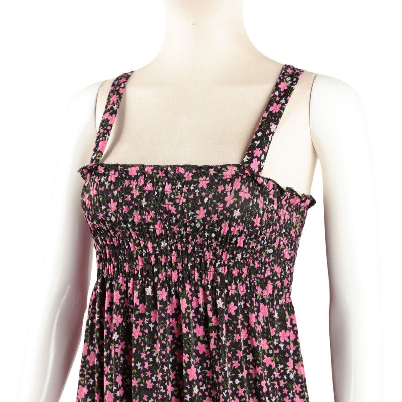 فستان نسائي قصير بلون خمري مزين بورود صغيرة متعددة الألوان، بتصميم بدون أكمام وقصة انسيابية مريحة.