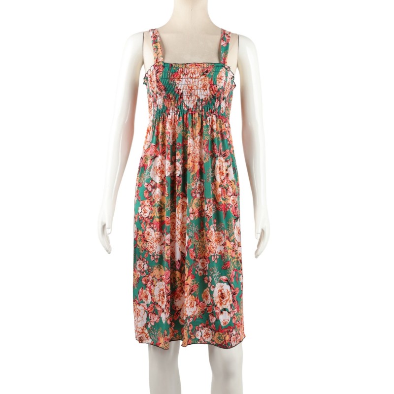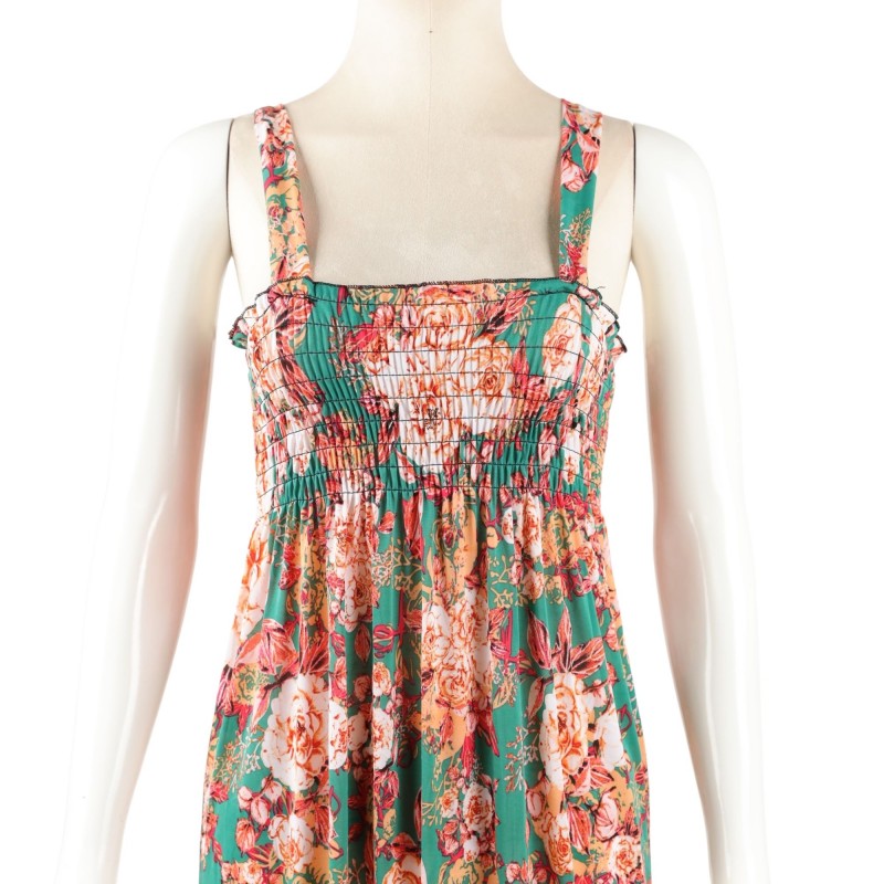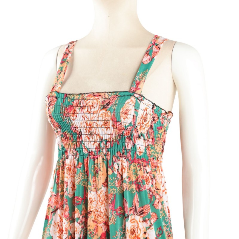 فستان نسائي قصير بلون زيتي مزخرف بورود زهرية أنثوية، بتصميم بدون أكمام وقَصّة مريحة تناسب البيت أو الأوقات الصيفية الخفيفة.