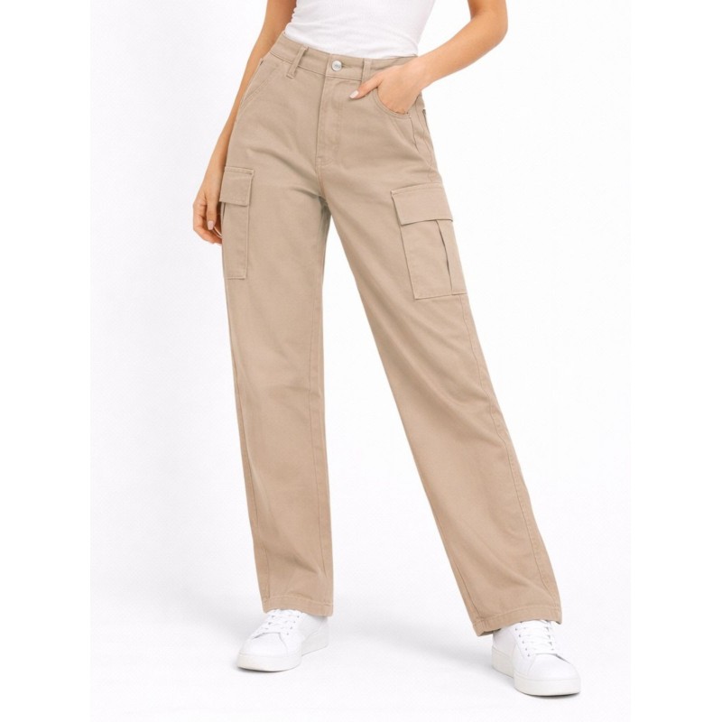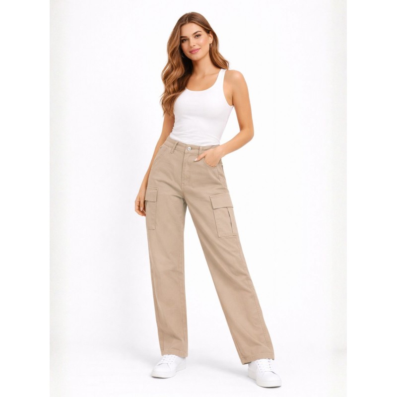 بنطلون نسائي بتصميم ارجل واسعة وخصر عالي مع جيوب جانبية لون بيج