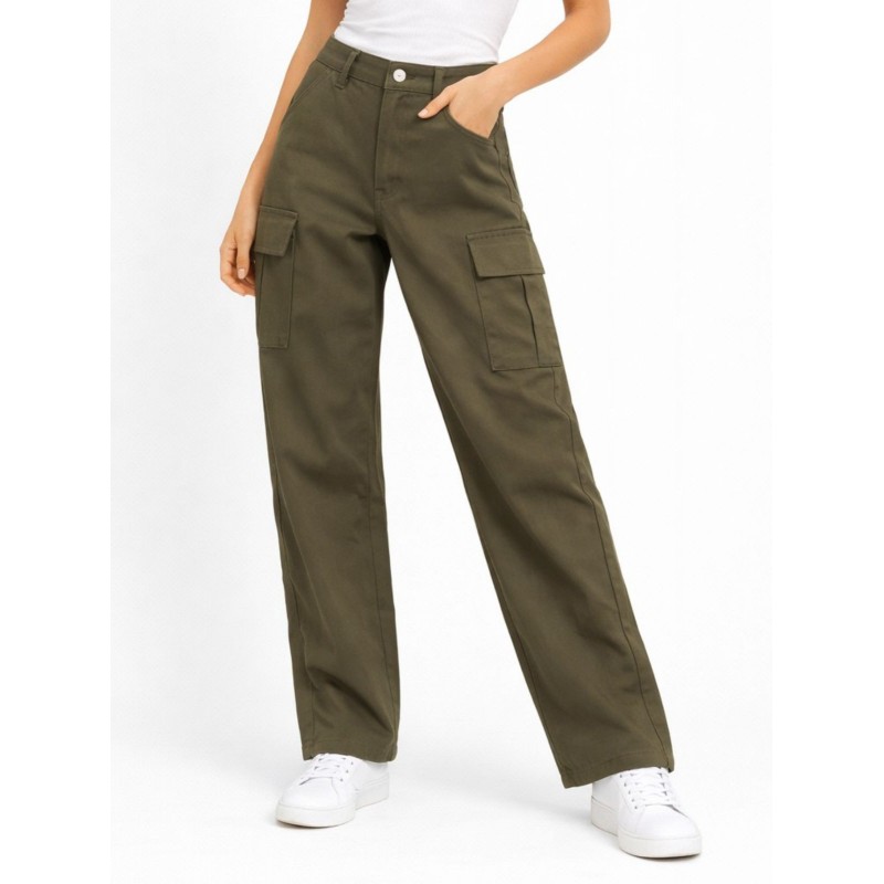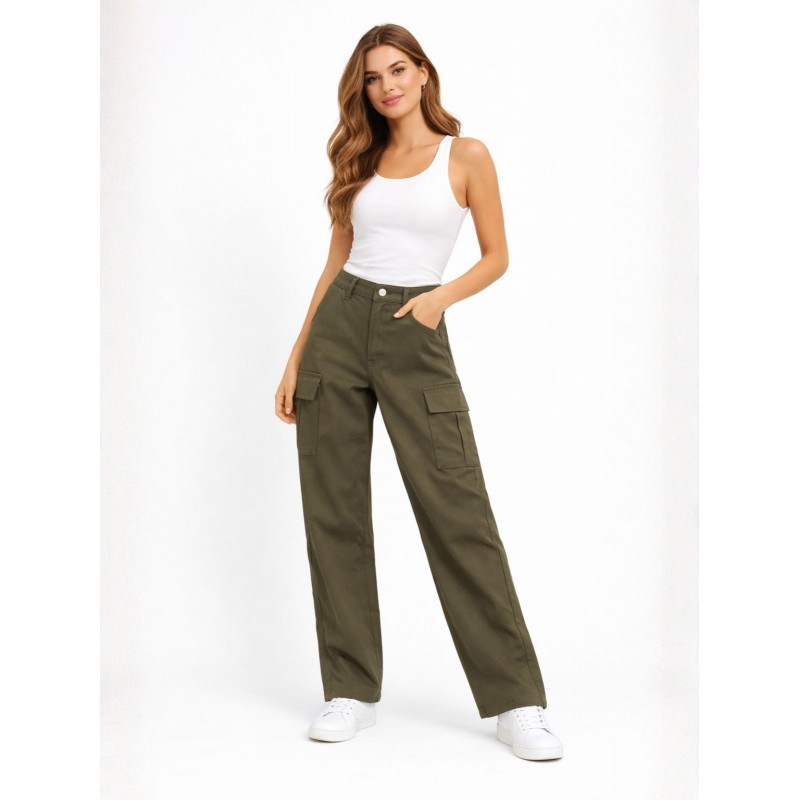 بنطلون نسائي بتصميم ارجل واسعة وخصر عالي مع جيوب جانبية لون زيتي