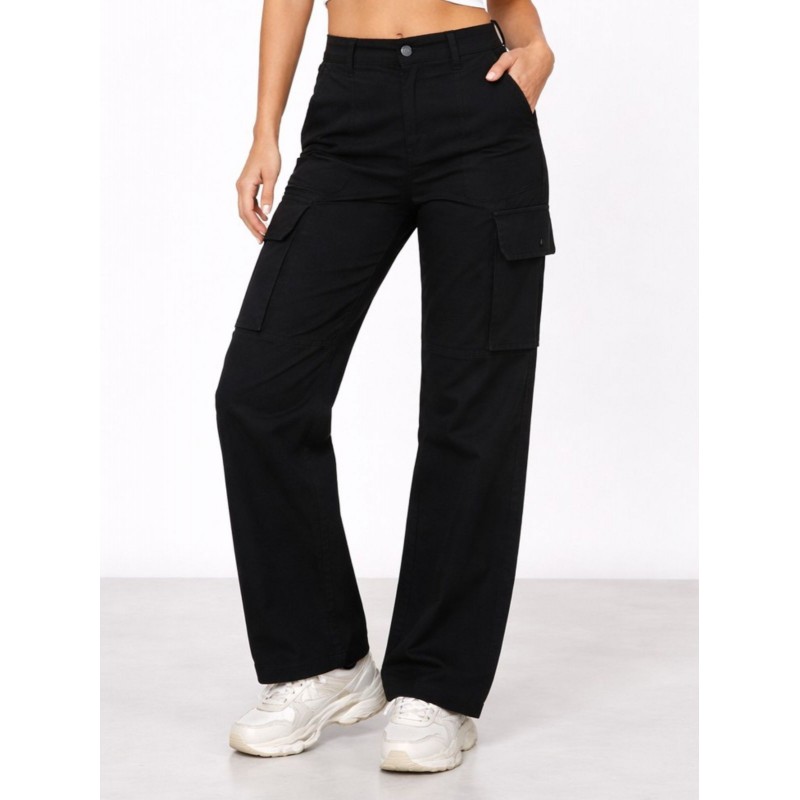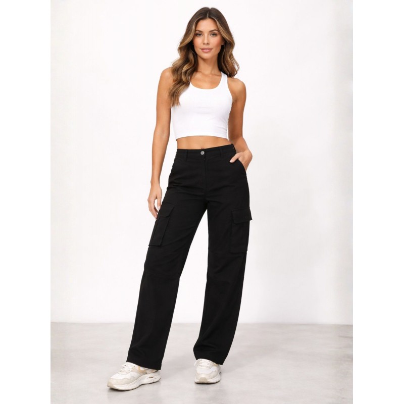 بنطلون نسائي بتصميم ارجل واسعة وخصر عالي مع جيوب جانبية لون أسود