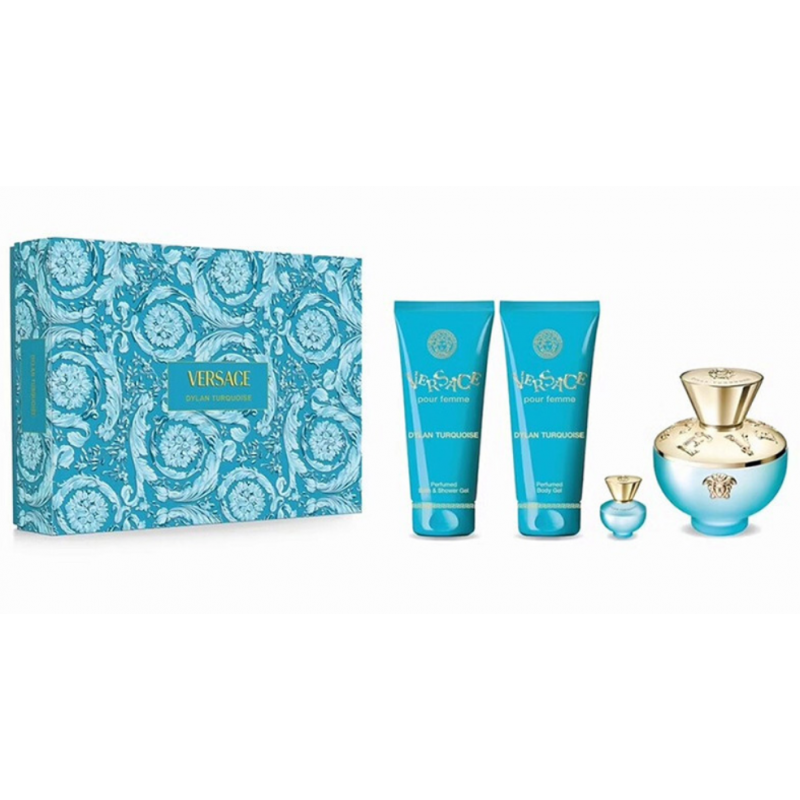 طقم Versace Dylan Turquoise Gift Set من دار Versace هو تجربة أنثوية منعشة مستوحاة من أجواء البحر والصيف… عطر يعكس الحرية، الإشراق، والجاذبية الطبيعية.