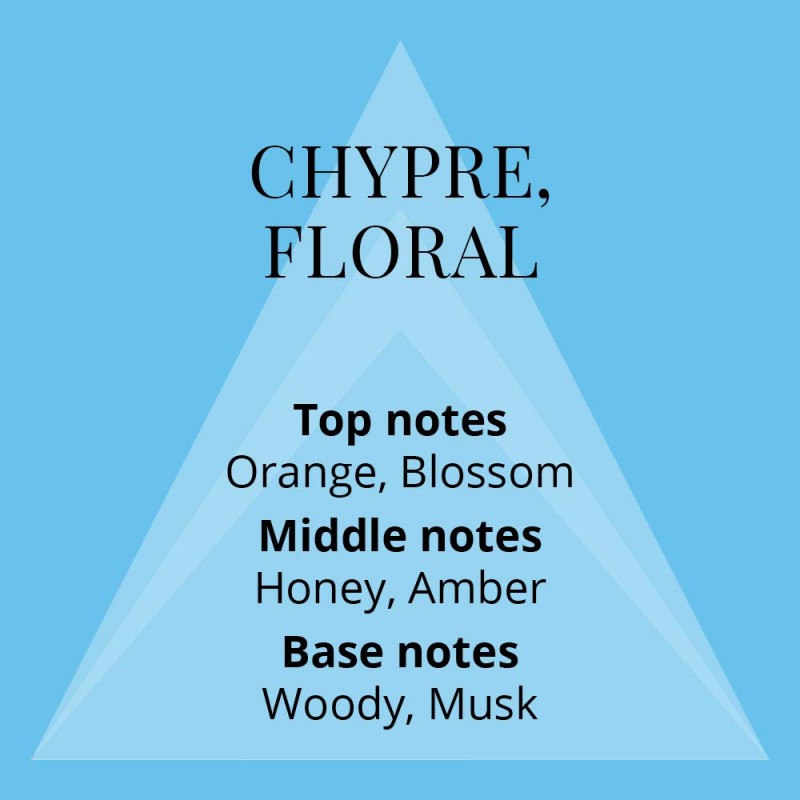 عطر زهري - فواكه للنساء . إفتتاحية العطر الليمون, الفريزيا, الكرز و الخوخ; قلب العطر زنابق الوادي, الورد و الياسمين; قاعدة العطر تتكون من الراتينجات, المسك و العنبر.