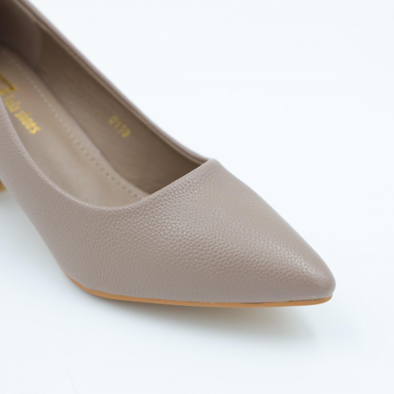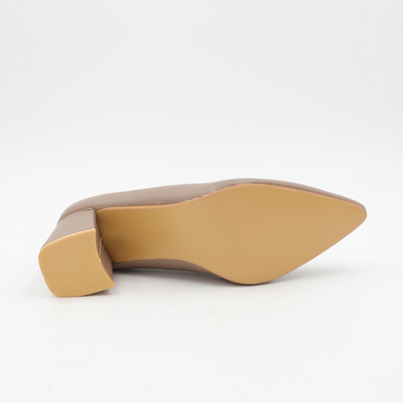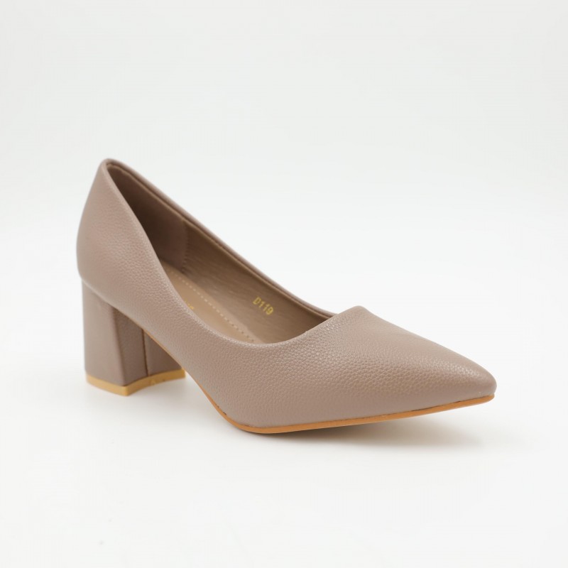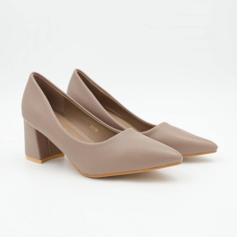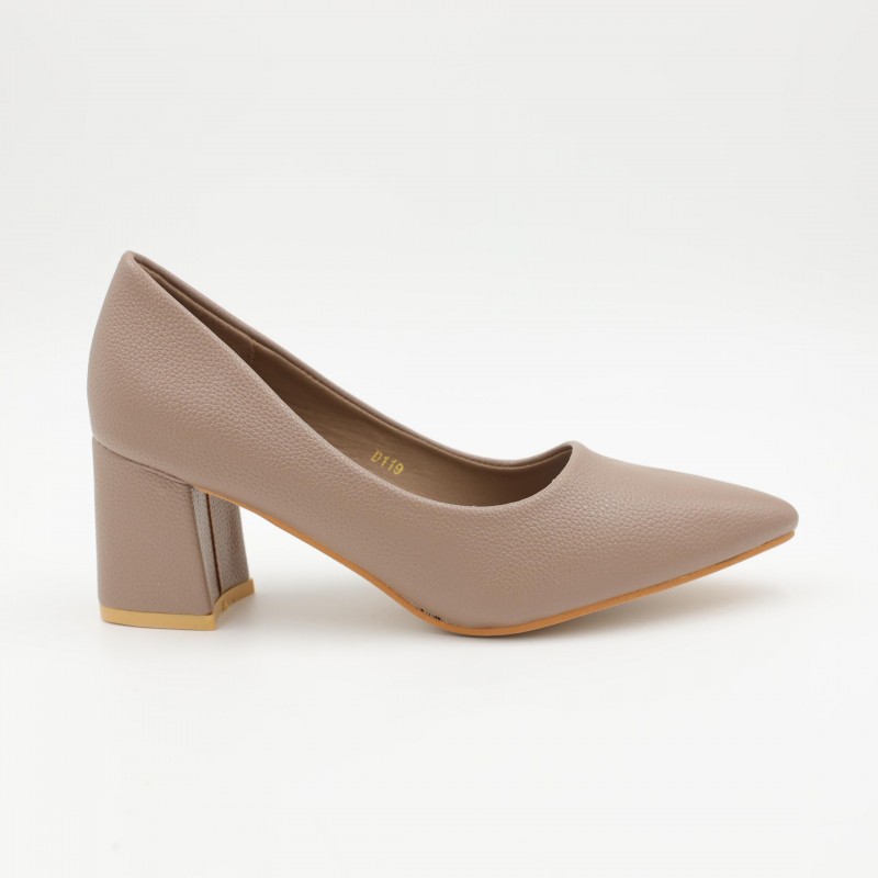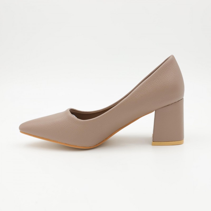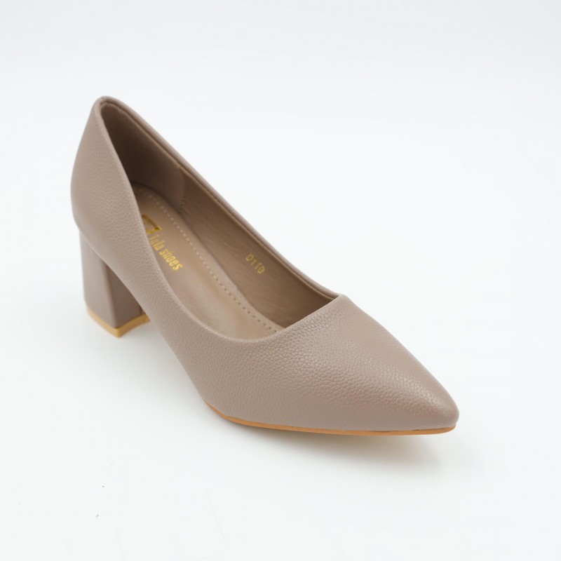 يتميز بكعب عريض وعالي يوفر ثباتًا ممتازًا وراحة أفضل أثناء المشي مقارنة بالكعب الرفيع، مع مقدمة مدببة تضيف لمسة أنثوية جذابة. الزخرفة المعدنية الصغيرة على الجزء الأمامي تمنح الحذاء مظهرًا أنيقًا دون مبالغة، بينما الخامة الناعمة تضمن راحة القدم عند الارتداء لفترات طويلة.