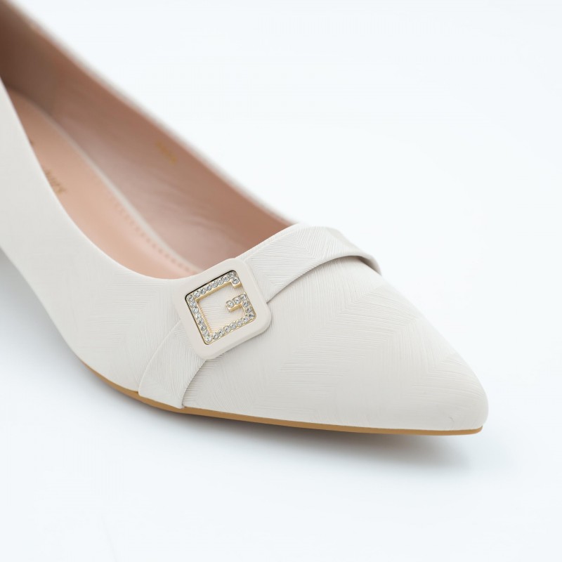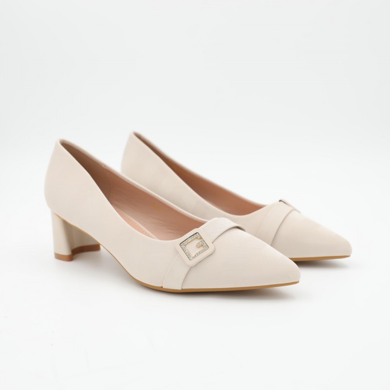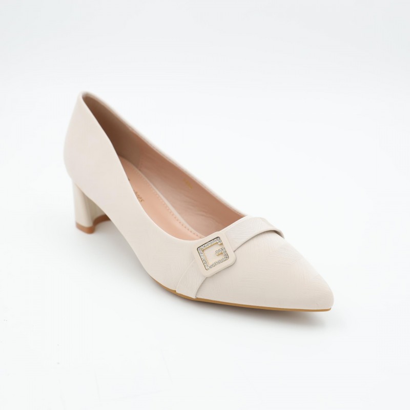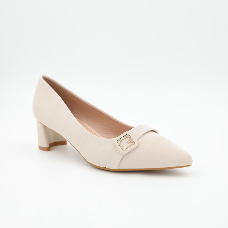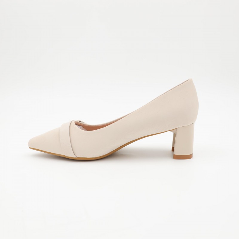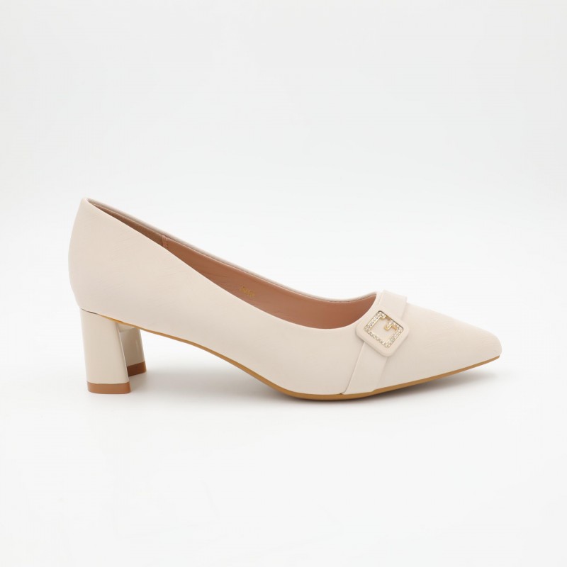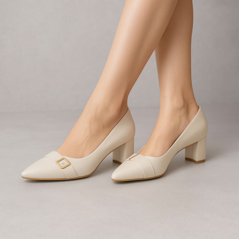 يتميز الحذاء بمقدمة مدببة تضيف لمسة أنثوية أنيقة، مع تفصيل زخرفي ناعم في المقدمة يعزز جمال التصميم دون مبالغة. الكعب العريض المتوسط يوفر ثباتًا أفضل أثناء المشي ويمنح راحة ملحوظة حتى مع الارتداء لفترات طويلة.