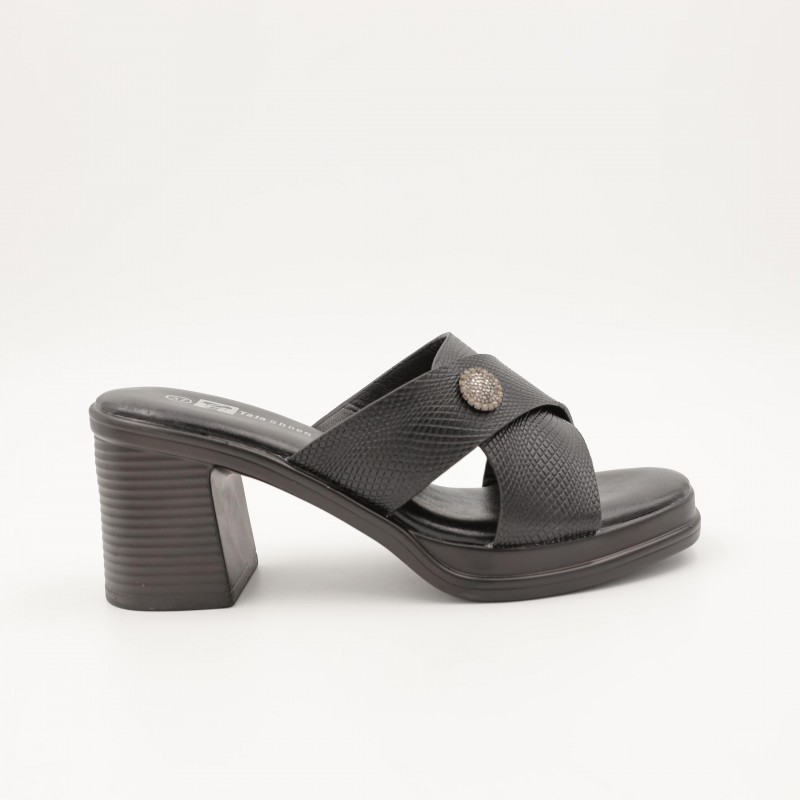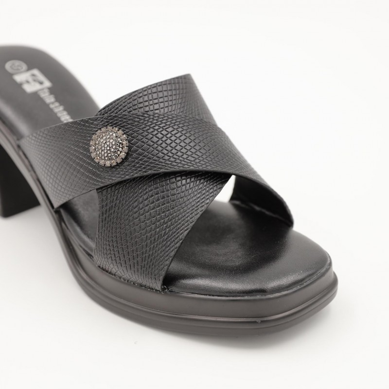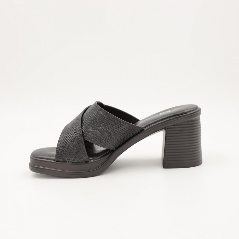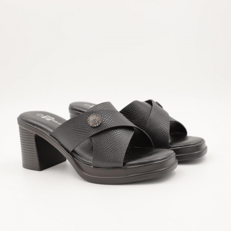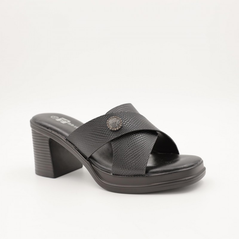 يتميز بتصميم مفتوح مع حزامين متقاطعين يمنحان ثباتًا جيدًا للقدم، إضافة إلى تفصيل دائري أنيق في المنتصف يضفي لمسة فخامة ناعمة على التصميم. الكعب المتوسط العريض يوفر توازنًا وراحة أثناء المشي، ما يجعله مناسبًا للارتداء لفترات طويلة دون تعب.
